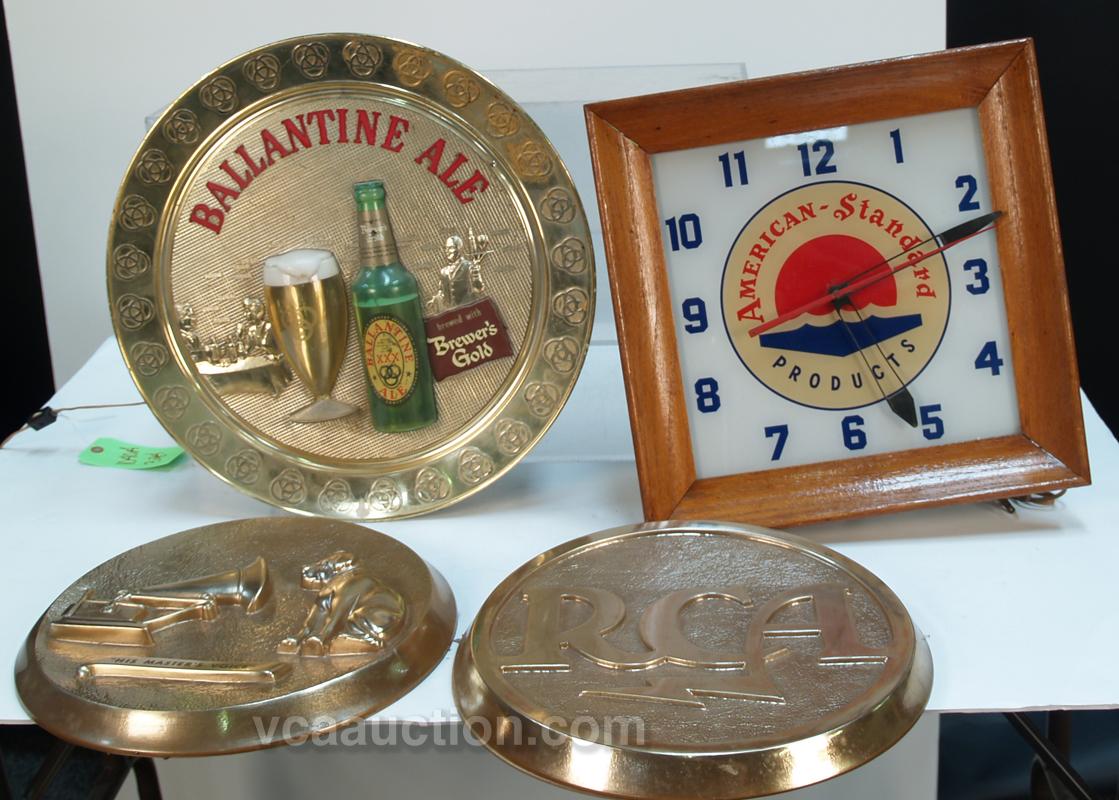 Lot Of 4 Signs: 1 - plastic wall mount "Ballantine Ale" light-up sign - 18" diam, 1 - wall mount wood & glass light-up "American Standard Products" clock - 16" x 16" & 2 - plastic cardboard easel back signs "His Masters Voice" & "RCA" - each 15" diam