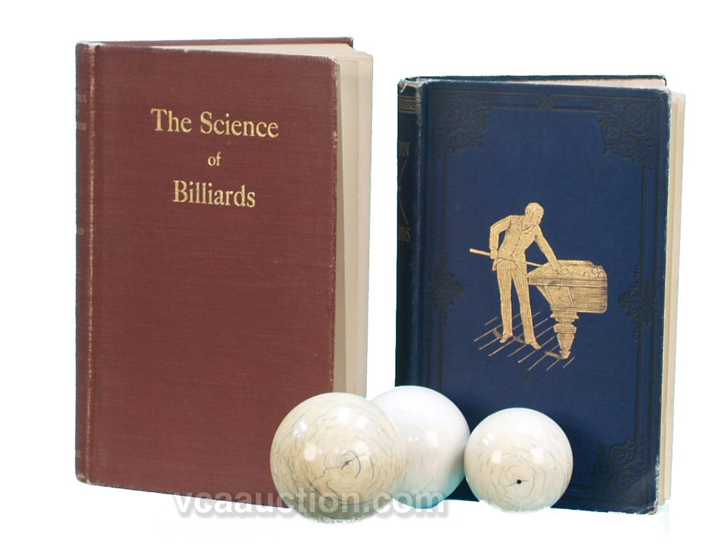Lot Of 5 Billiard Items: 3 - vintage ivory billiard pool balls & 2 vintage hardback billiard books 1- The Science Of Billiards by J.D. Stoddard, 1913 & 1 - Modern Billiards by The Brunswick-Balke-Collender Co. New York, 1904