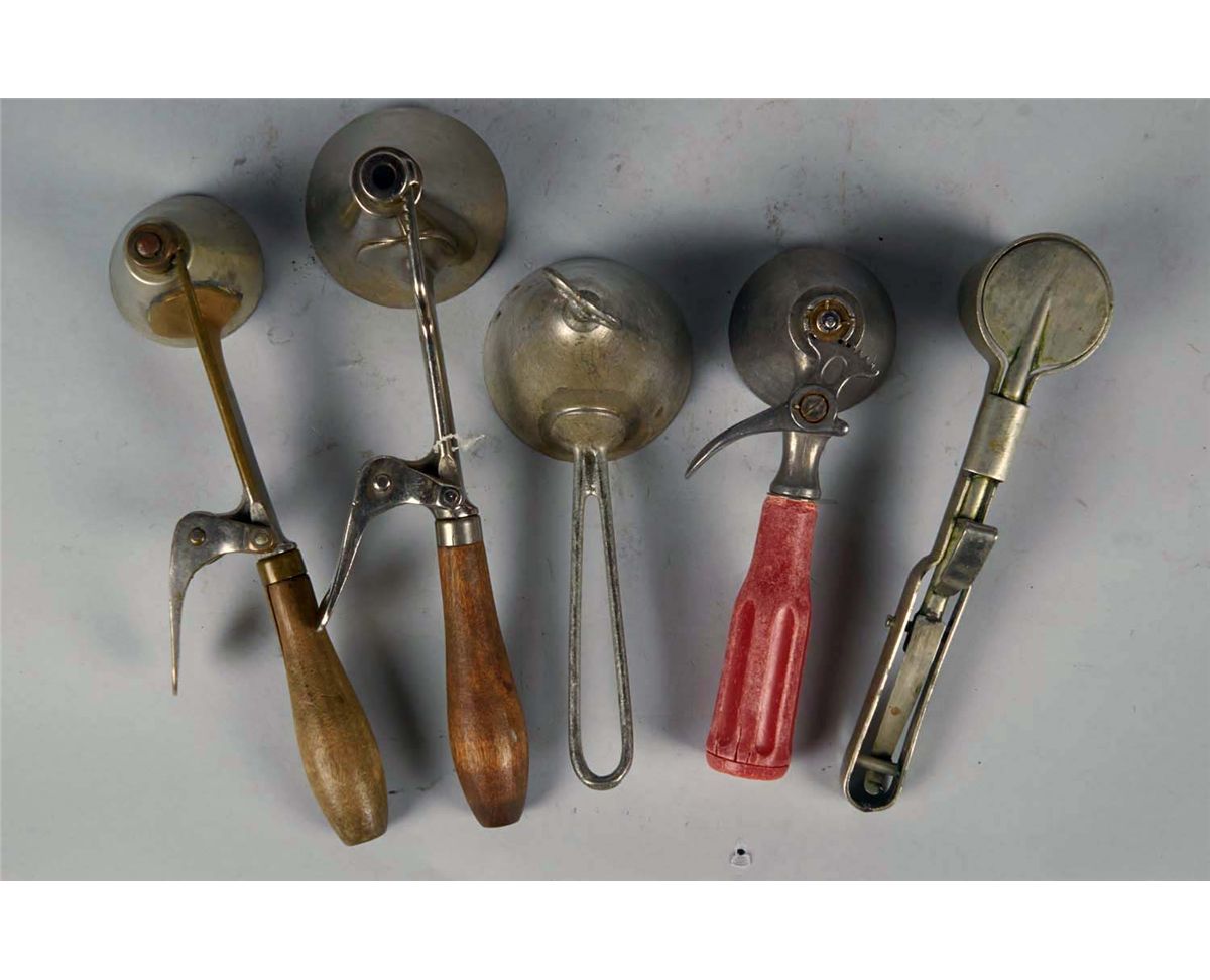 Including 1 - Clad's Disher (8" Long), 1 - Gilchrist's No. 33, missing inner scraper (10.25" L), 1 - Gilchrist's No. 33 size 16 (10" L), 1 - Progressus Italy U.S. Pat. 2882454 size 16 with ed plastic handle (7.5" ), and 1 - without markings (8.5" L) Condi