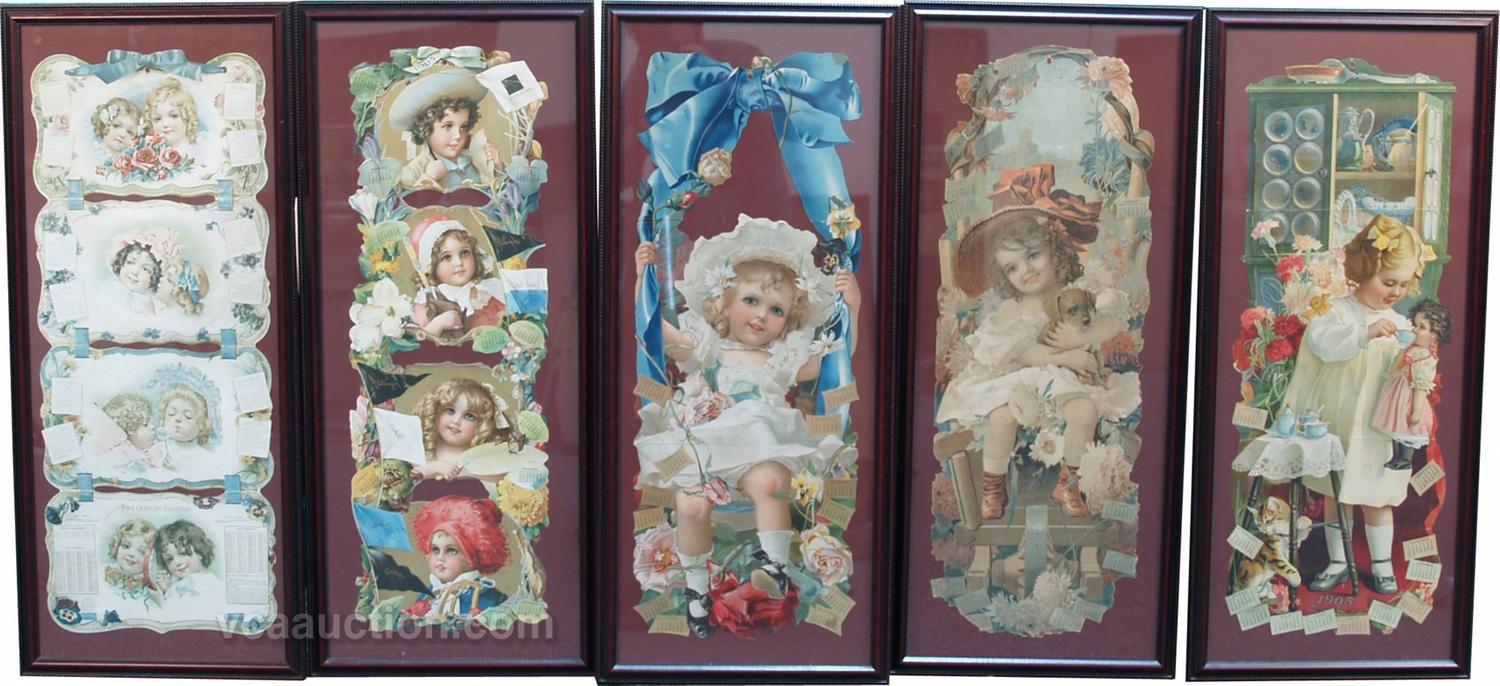 Lot Of 5 Die-Cut Calendar's w/ Cute Little Girls: 1 - The Christian Herald Bible House, NY. (1900) "Two Century Calendar", & 4 - Grand Union Tea Co. Brooklyn, New York (1905, 1906, 1907 & 1908) all in matching frames - each 15" x 34"