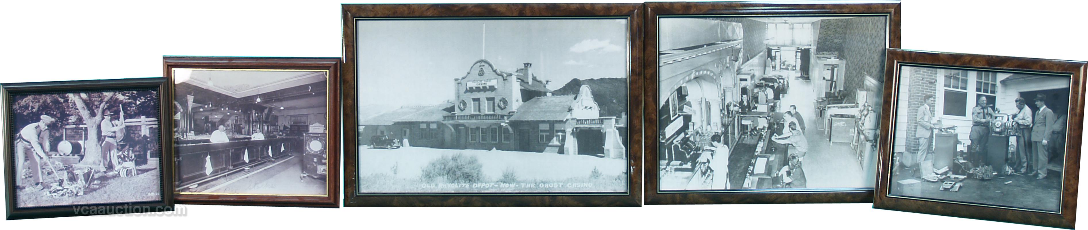 Lot Of 5 Framed Old Time Photos: Old Rhyolite Depot - Now The Ghost Casino - 18" x 13", 2 photos of old bar scenes - 11" x 9" & 16" x 12" & 2 photos of police officers breaking slot machines - 9" x 8" & 11" x 10".