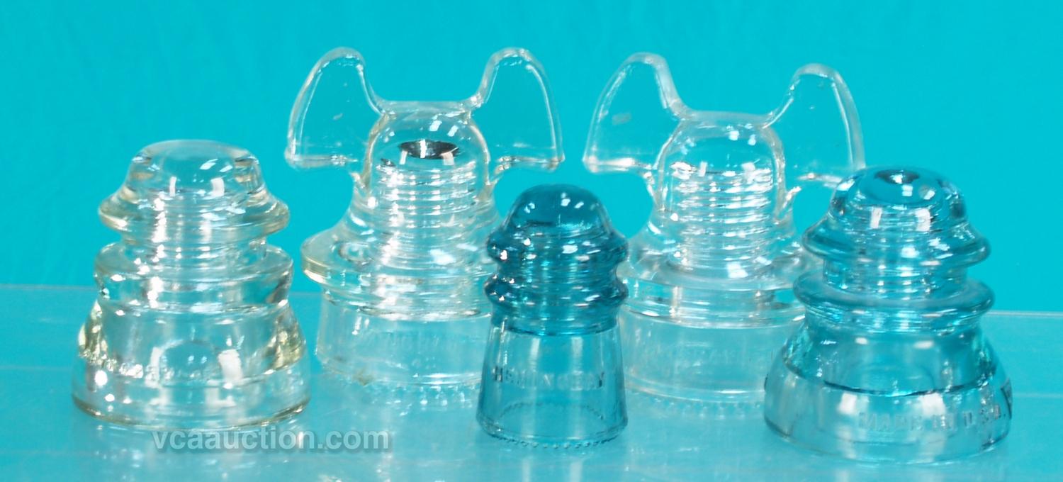Lot Of 5 Glass Telephone Insulators: 2 - Hemingray - 60 w/ wings, 1 - Hemingray- 45, 1 - Hemingray (blue glass) & 1 - Whitall Tatum Co. No. 1 (blue glass) (all in great condition)