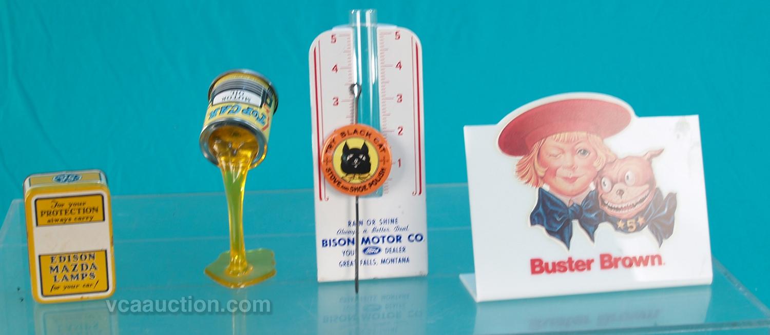 Lot Of 5 Items: 1 - plastic countertop stand-alone "Buster Brown" advertisement, 1 - G.E. Edison Mazda Lamps little tin box, 1 - "Black Cat Stove & Shoe Polish" hook w/ ad, 1 - Bison Motor Co. countertop stand-up tin & glass rain gauge & 1 - Top Car Motor Oil mini oil can pouring out oil.