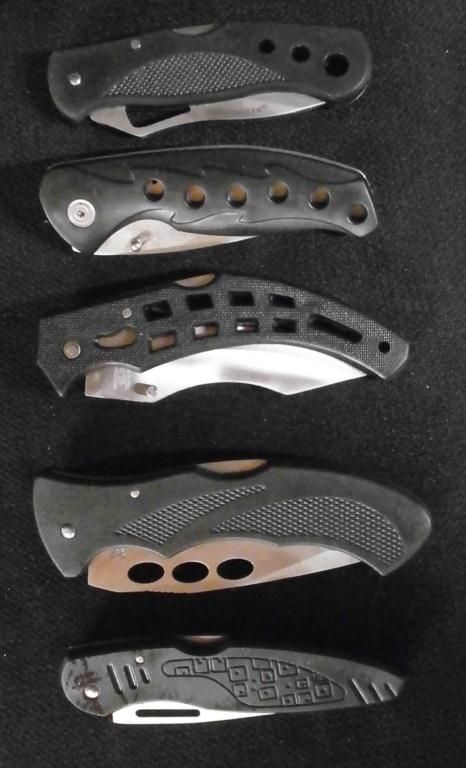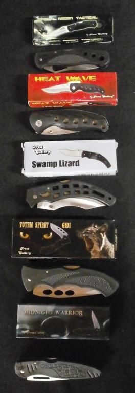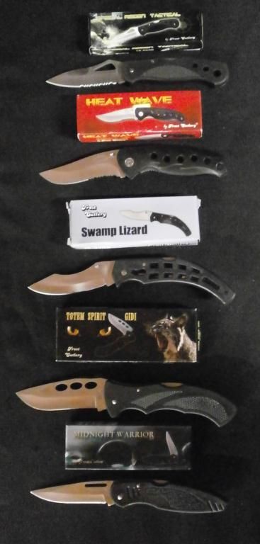 W/Stainless Steel Blade & Thumb Stud, Composition Handle Scales W/Textured Grip & Pocket Clip. Special Recon Tactical 4 1/2" Lightweight Lockback W/Stainless Steel Blade & Etch, Textured Composition Handle. Swamp Lizard 5" Lockback Knife W/Brushed Stainless Steel Blade, Thumb Screw, Plastic Handle & Pocket Clip. Heat Wave Heat Wave 4 1/2" Linerlock Knife W/Matte Finish Stainless Steel Blade, ABS Handle & Adjustable Tension Setting, Metal Thumb Stud & Pocket Clip. Totem Spirit:Gidi 5" Lockback Knife W/Black Coated Stainless Steel Blade, Frame, & Thumb Stud, Anodized Aluminum Handle W/Diamond Texture & Lanyward Hole.
