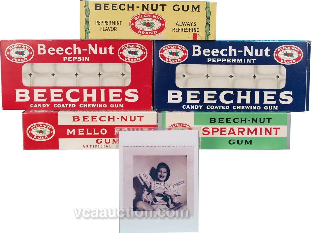 Lot Of 5 Oversized Cardboard Beech-Nut Gum Display Boxes w/ photo of girl holding 3 of the boxes for advertisement