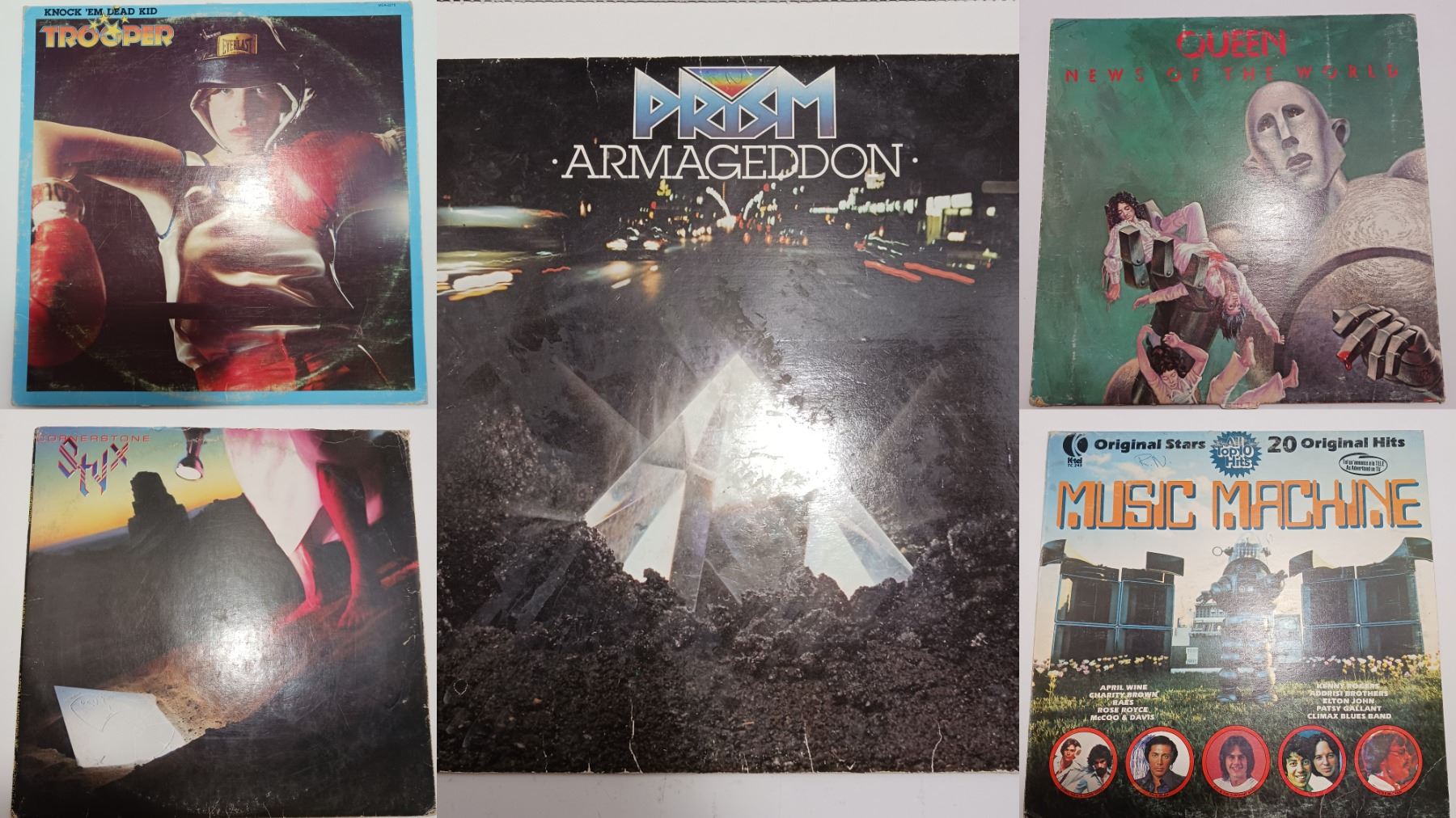 Lot Of Vinyls, Prism - Armageddon, Trooper - Knock 'Em Dead Kid, Styx - Cornerstone, Queen - News Of The World, & Various ‎- Music Machine