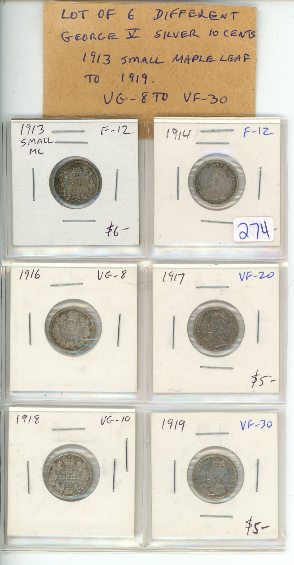Lot Of 6 Different George 5th Silver 10 Cents 1913-1919