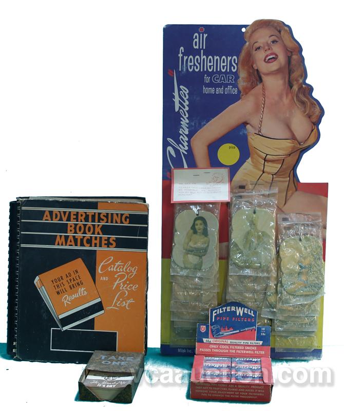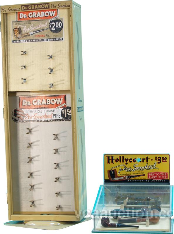 Lot Of 6 Items: 1 - Hollycourt glass display case for tobacco pipes, 1 - Filterwell Pipe Filters cardboard display w/ product, 1 - "Take One' cardboard display box w/ Hollycourt Pipe's mini catalog's, 1 - catalog price list for match books, 1 - Dr. Grabow Pipes store countertop spin tin display rack - 32" tall & 1 - die-cut cardboard store display for "Girlie" air fresheners w/ product
