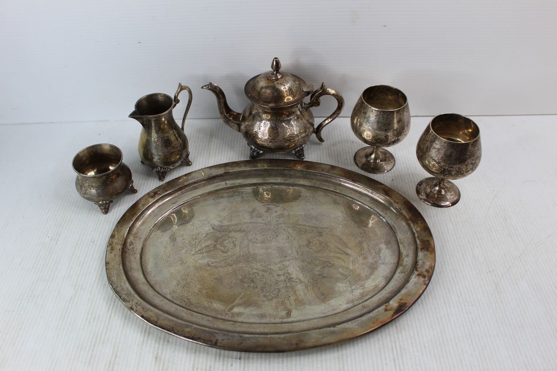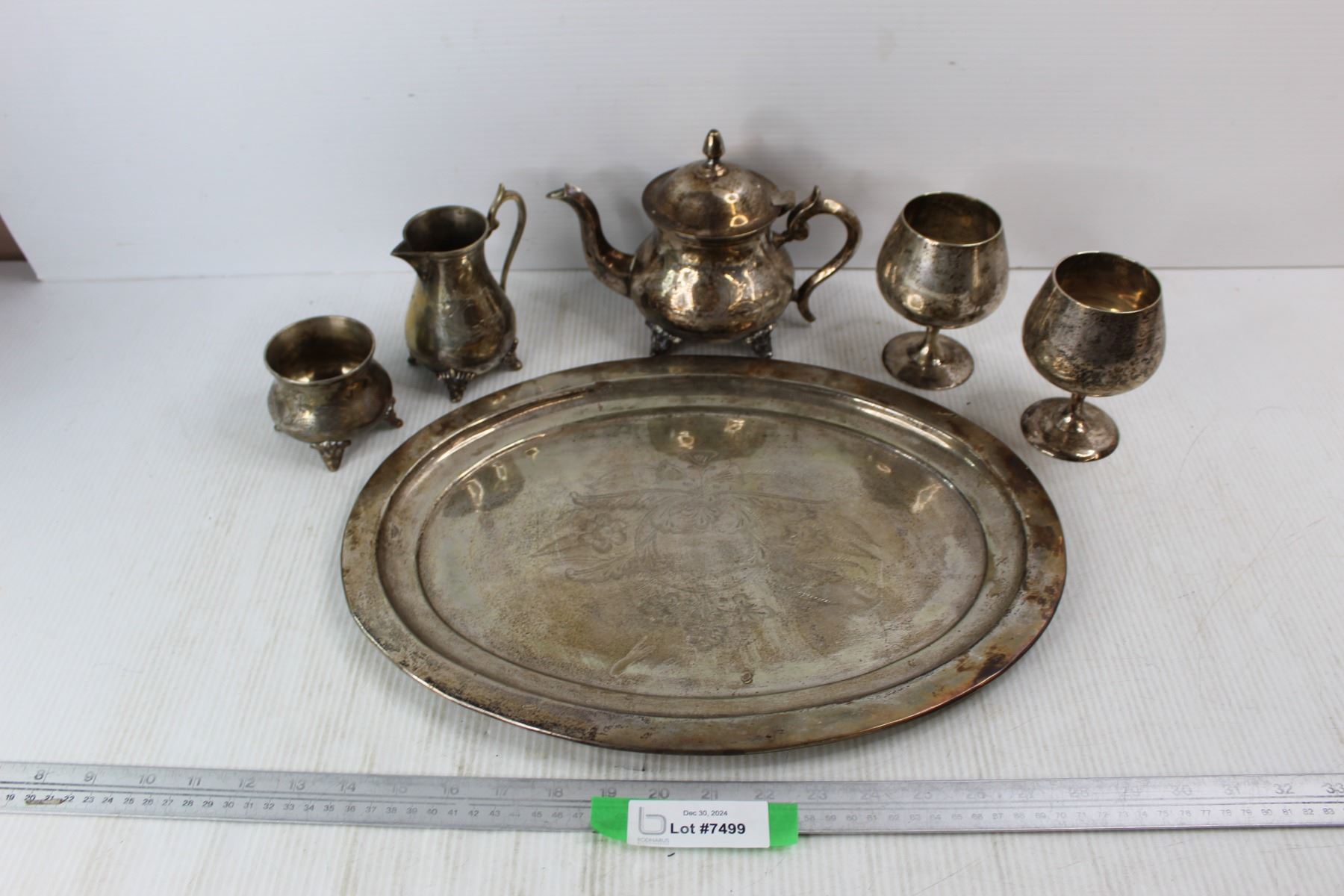 Lot Of (6) Plated Dishes, Serving Platter, Cream & Sugar Set, (2) Goblets
