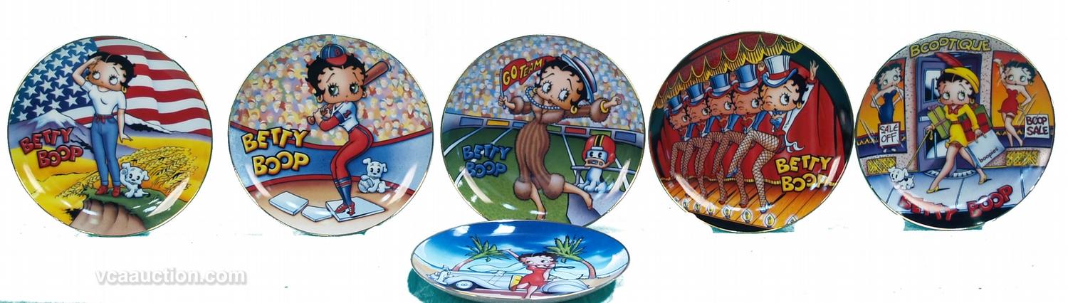 Lot Of 6, Set Of Porcelain "Betty Boop - America's Sweetheart" Collector Plates. Each plate comes w/ certificate of authenticity, the set includes: "Stars & Stripes Forever", "Shop Til You Drop", "This Is Life", "Sweetheart Slugger", It's Show Time" & "Homecoming Queen" - each 8" diam in brand new condition