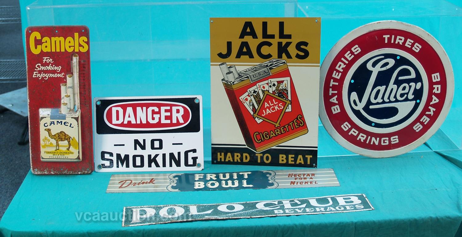 Lot Of 6 Signs (5 tin & 1 porcelain) including Polo Club Beverages, All Jacks Cigarettes, etc.