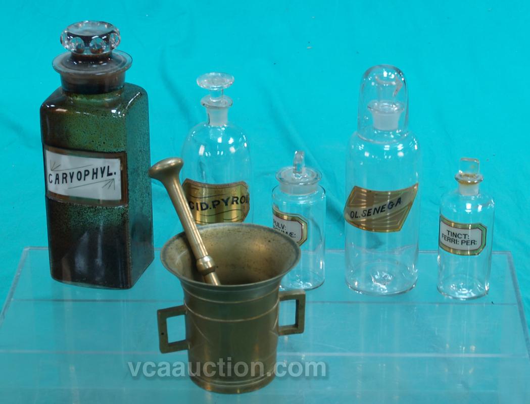 Lot Of 7 Early Items: 5 - assorted sizes glass apothacary jars w/ lids & brass mortar & pedestal set