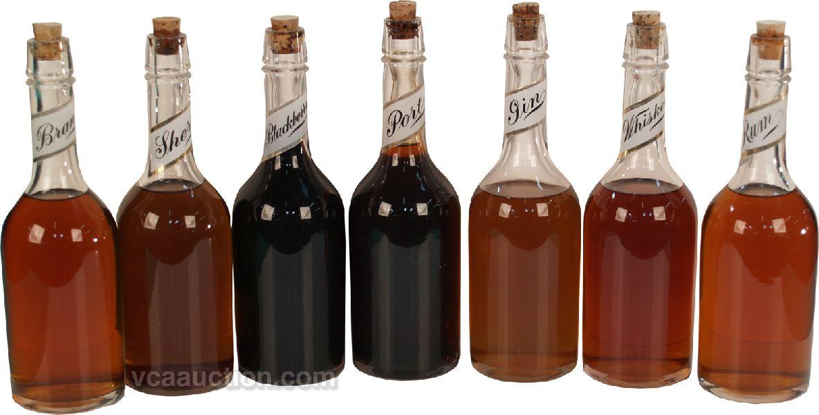 Lot Of 7 Glass 2nd Row Bar Bottles w/ Reverse Glass Labels Around The Neck w/ Stoppers: 1 - Port, 1 - Rum, 1 - Brandy, 1 - Whiskey, 1 - Sherry, 1 - Gin & 1 - Blackberry. Second row bottles held a lesser grade of whiskey and were used when a bar patron w