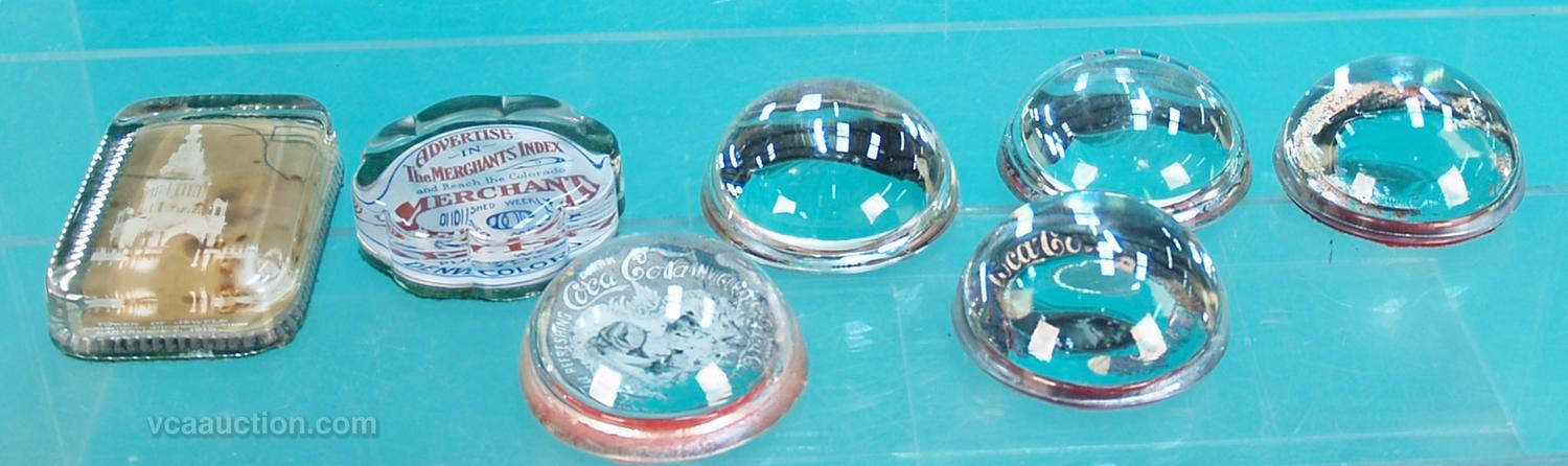 Lot Of 7 Glass Paperweights: 1 - Oilzum, 2 - Coca Cola's, 1 - Hambone Cigars, 1 - Denver, Colorado Merchant, 1 - Red Hat & 1 - Tower Of Jewels San Francisco (reproductions)