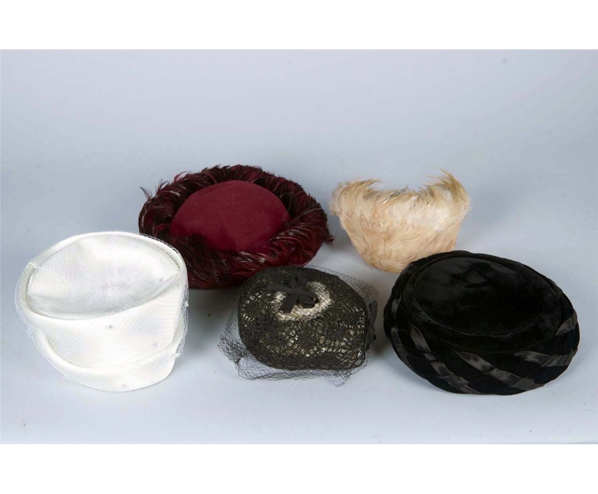 Including 1- Black velvet & ribbon hat, 1- White pill box hat w/netting, 1- Black velvet bow veil hat, 1- Netted hat w/bows & upper veil, 1- Peach colored feather hair cuff by Montgomery Wards Brentshire # A-79V, 1 - New York Creation #22 felt hat w/red f