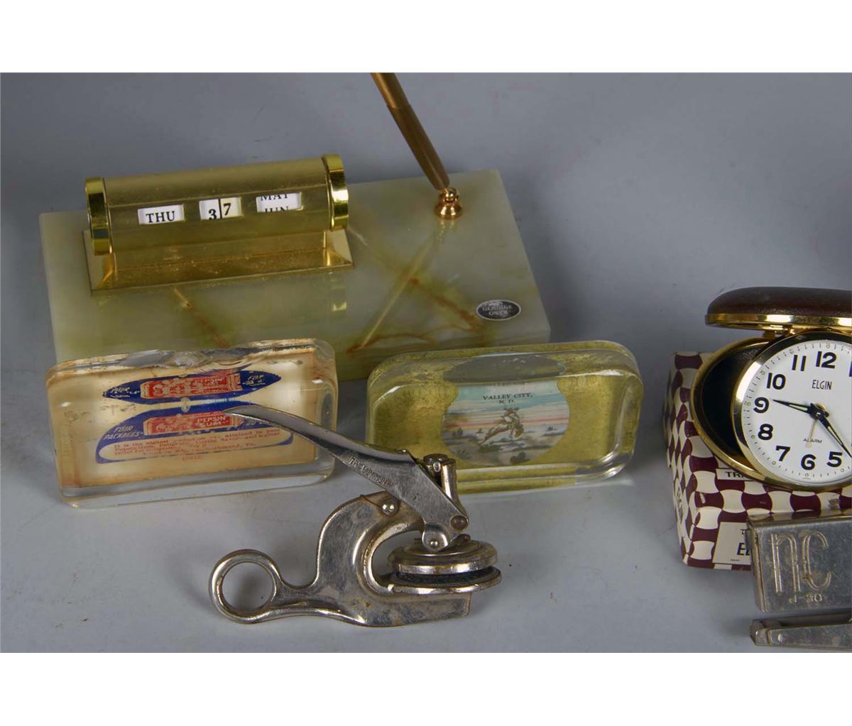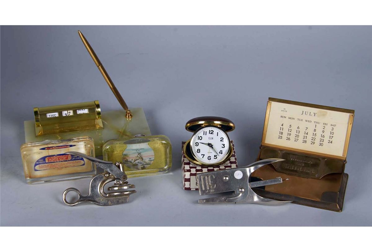 Including 1 - Brown Elgin travel clock in original box, No. 8762. Ca. 1960s. 3" in diameter, 1 - Brass index card holder with with manual perpetual calendar and embossed lid , "Dunham and Smith, Inc." Ca. 1930s. 5-3/4" x 3-5/8" x 1-1/2", 1 - The Aluminum