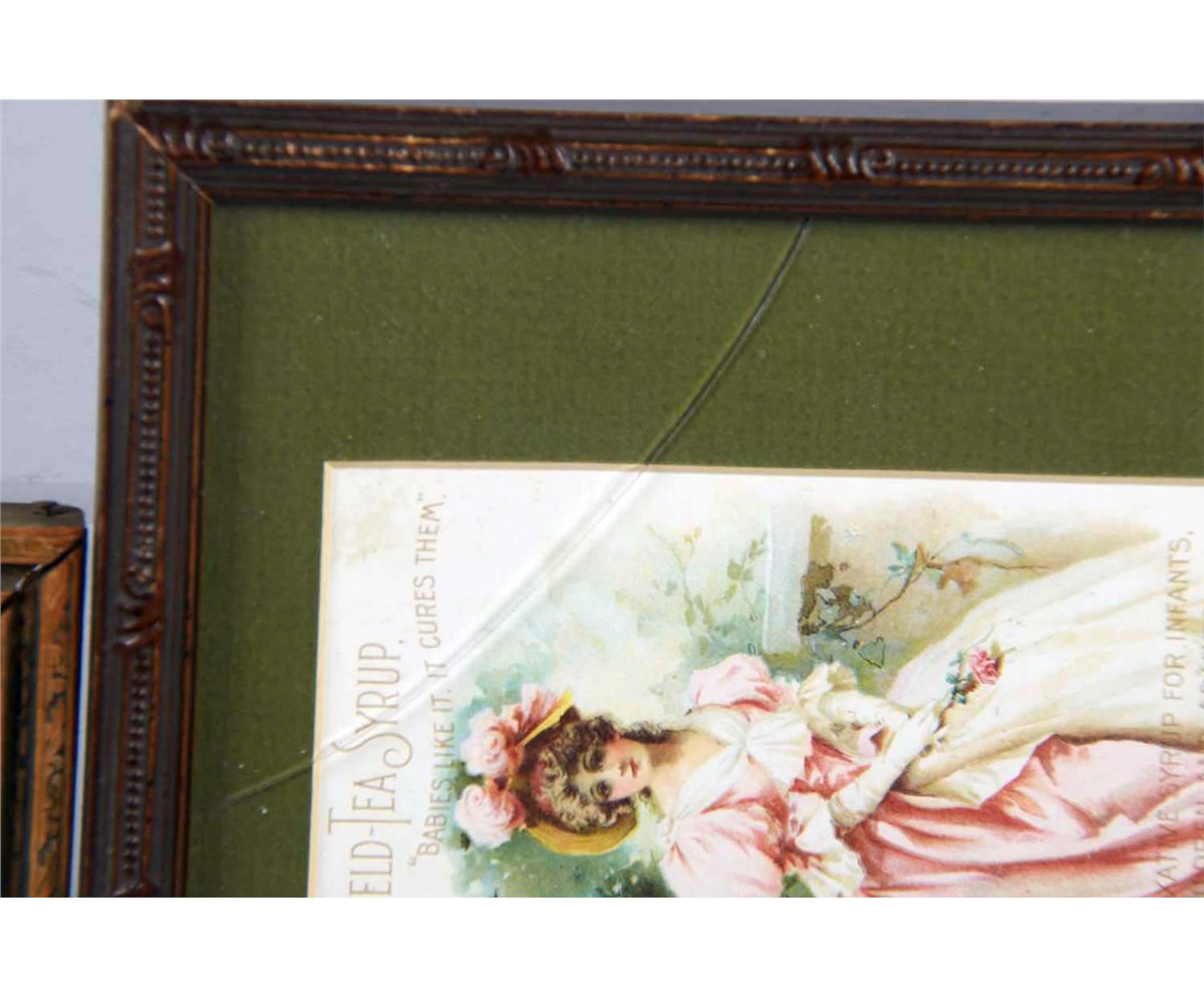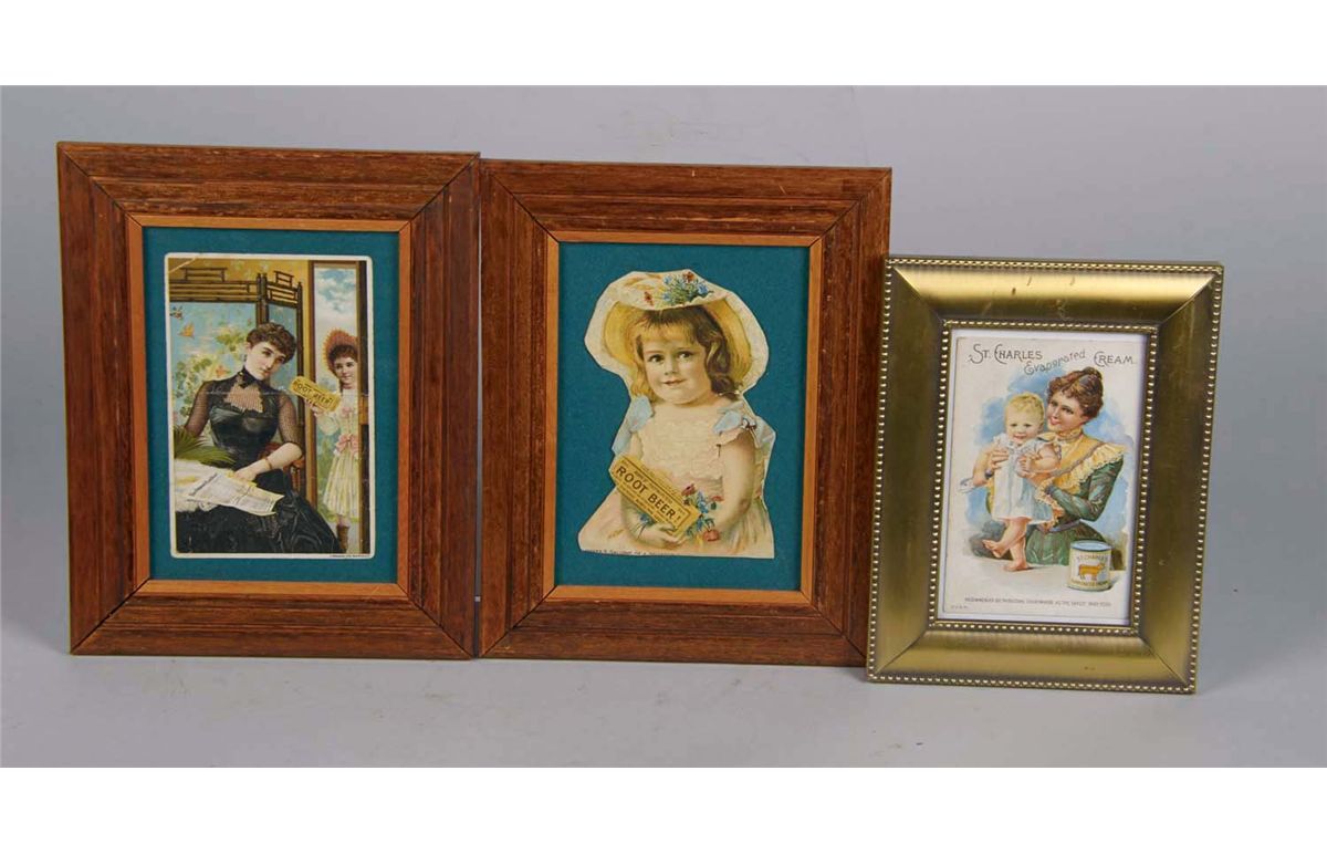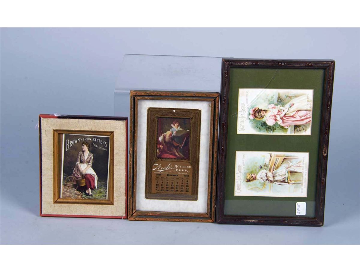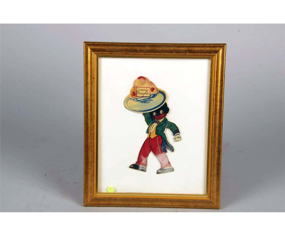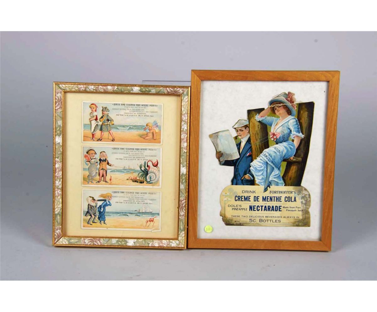 Each in frame, including 1- December 1905 Stroh's Detroit Bottled Beer mini-calendar, 1- Forthoffer's Creme de Menthe Cola / Dole's Pineapple Nectarade die cut advertising sign, 1 - Black Americana "Loving Thoughts" jointed cardboard sign with a Golly hol