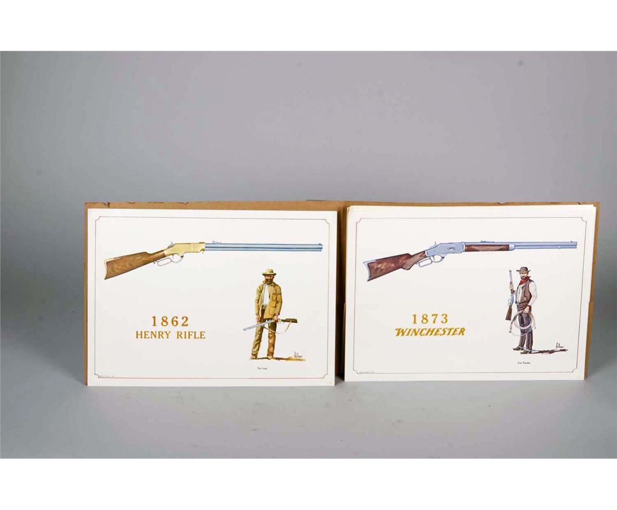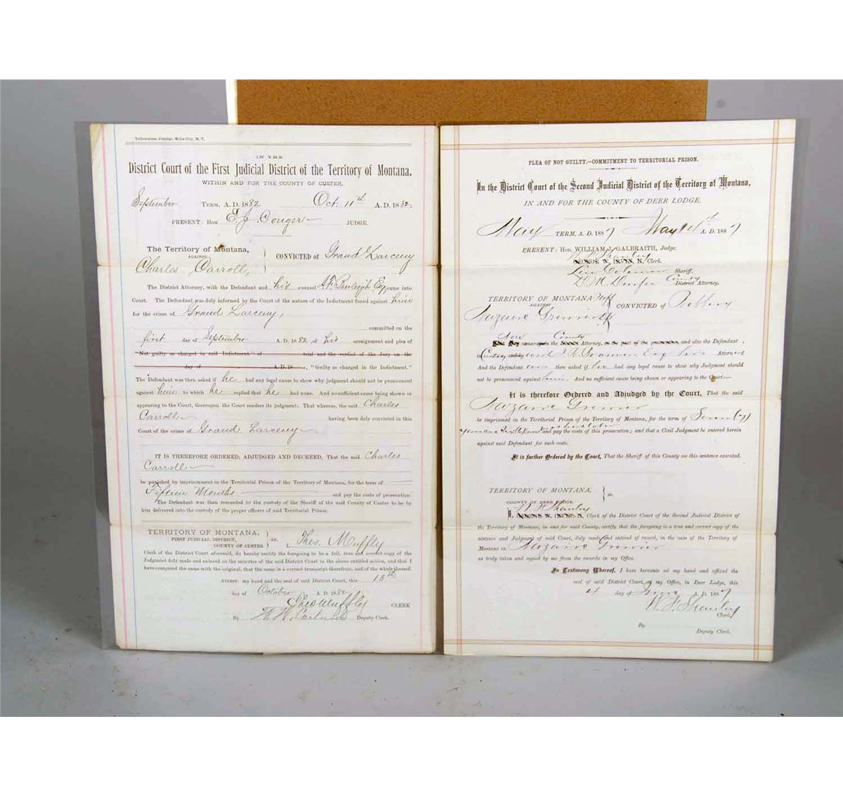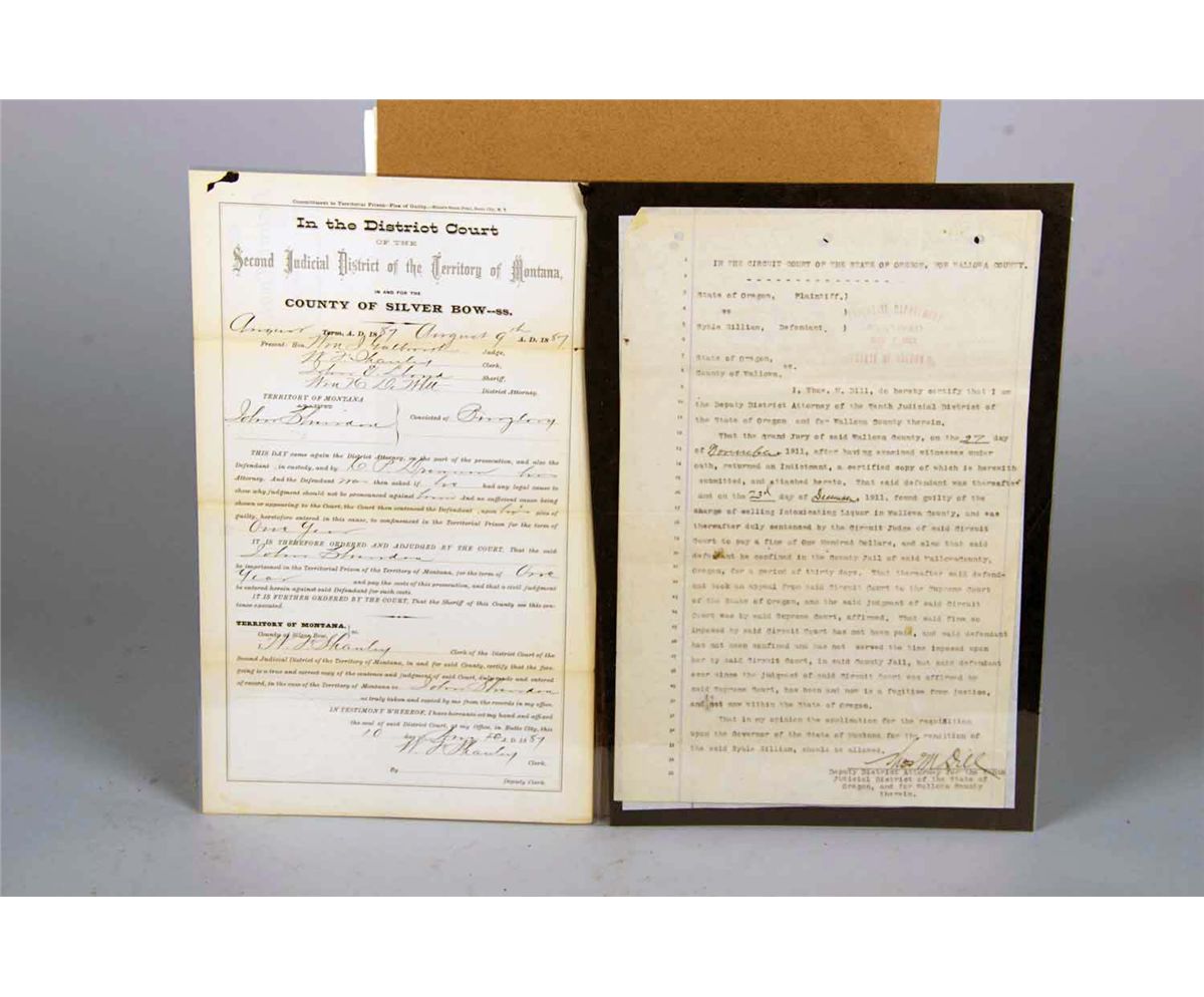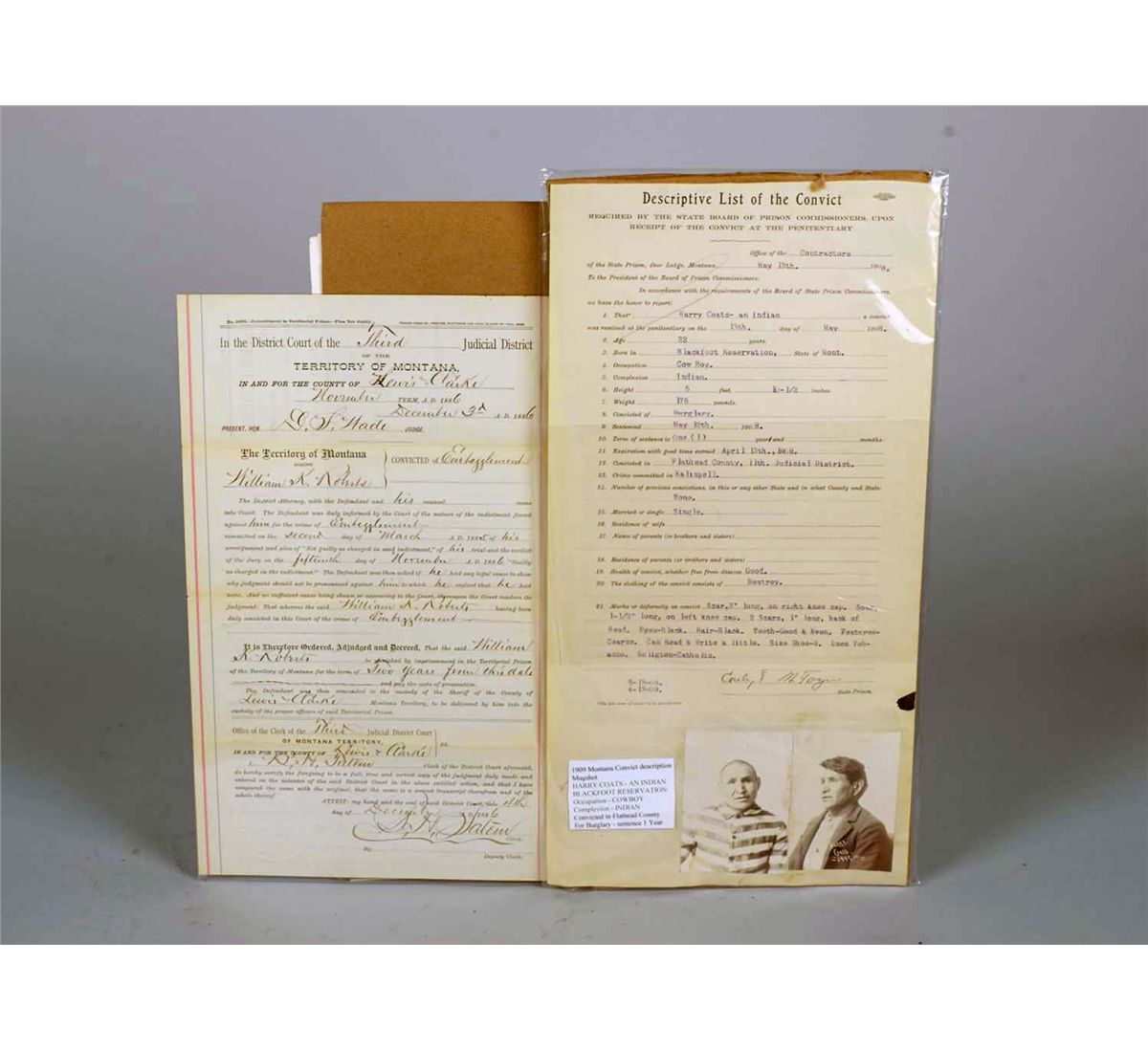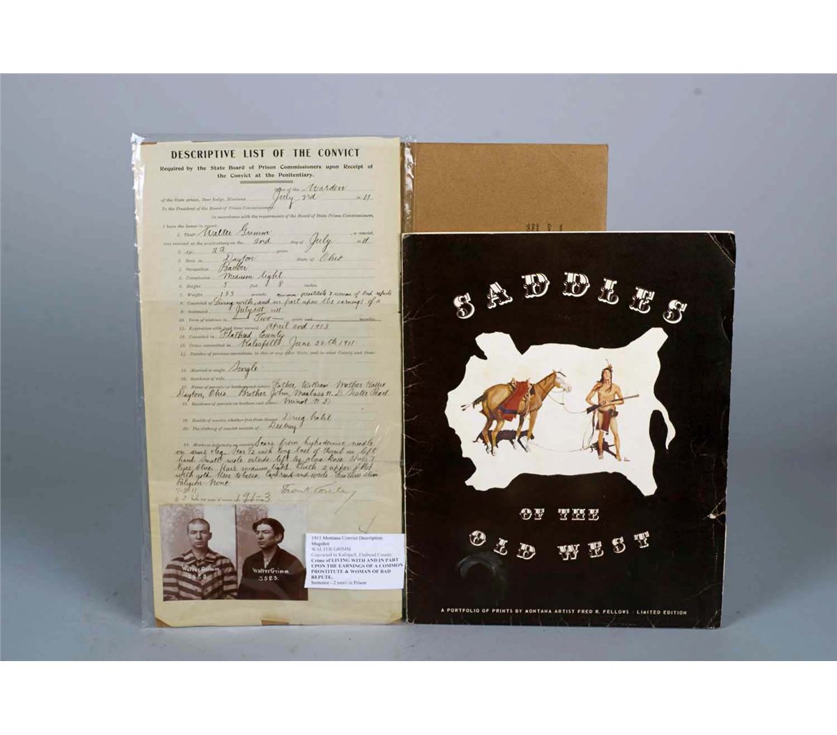 Including 2 - Sets of illustrations by Fred F. Fellows, Saddles of the Old West, and Wincheter on the Frontier, signed by the artist. Circa 1960s (16" x 11-3/8"), and 7 - legal documents such as judgements and descriptive lists of convicts. Circa 1880s . This lot includes early mugshots and convict reports.