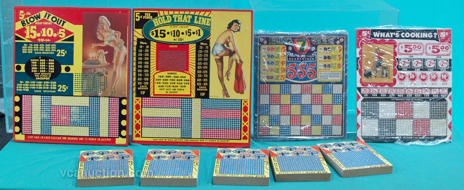Lot Of 9 Unpunched Punch Boards: 5 - New Bucks, 1 - Big 7 Put 'N' Take, 1 - What's Cooking?, 1 - Blow It Out & 1 - Hold That Line