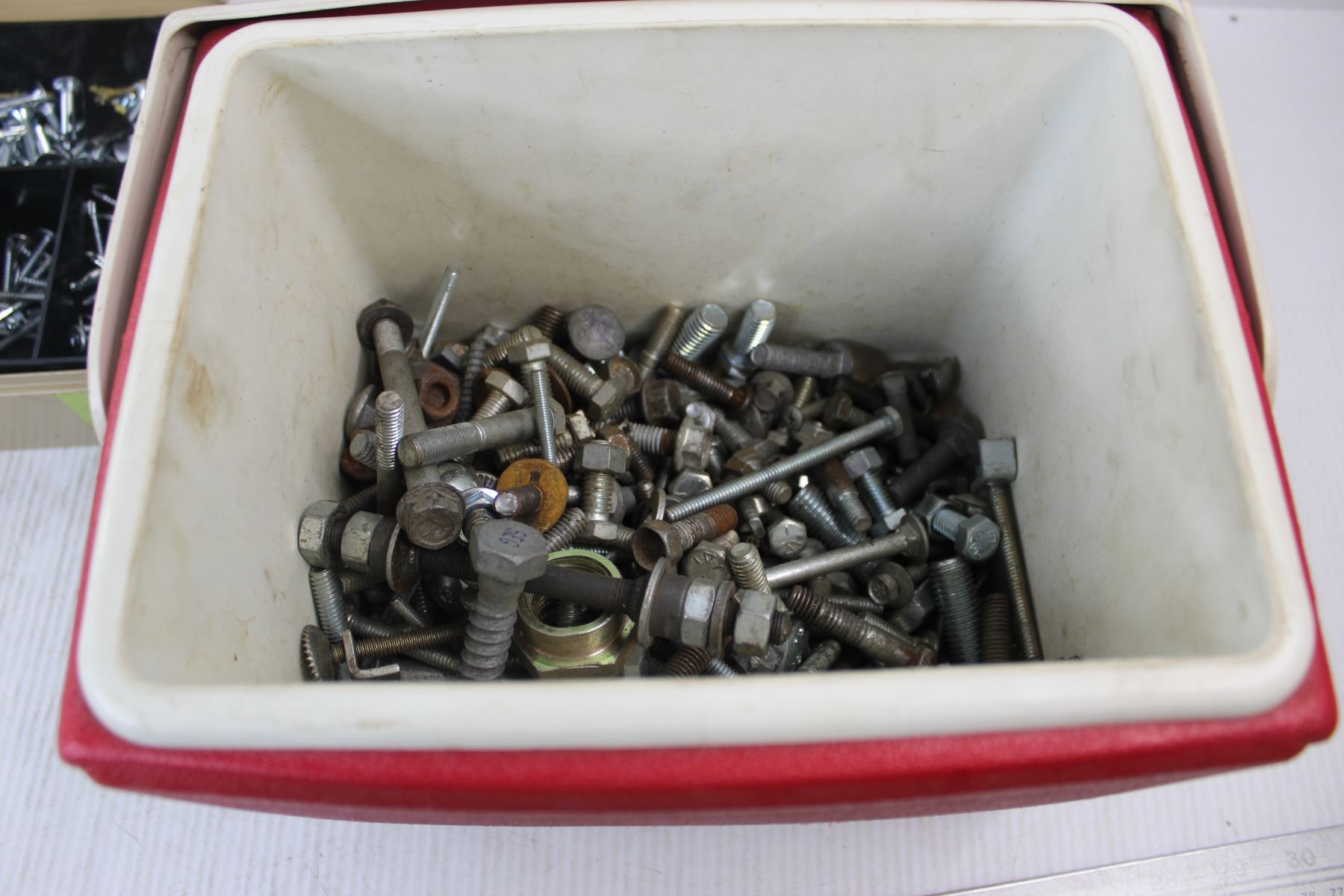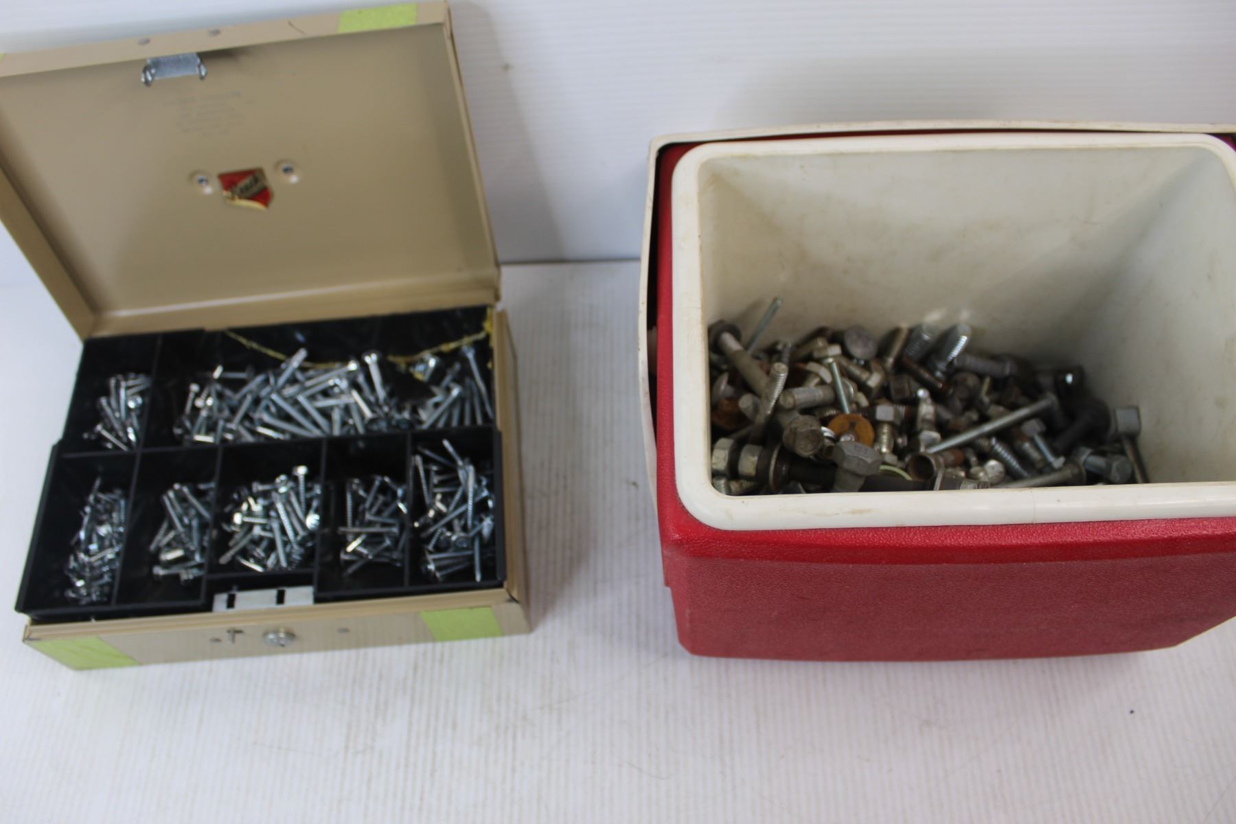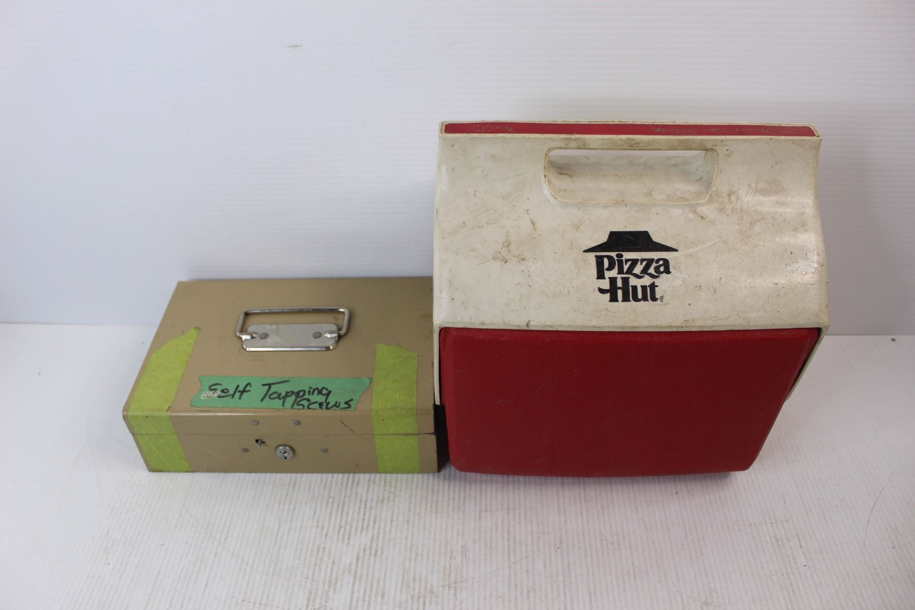 Lot Of Assorted Nuts/ bolts, Misc., Pizza Hut Igloo Cooler, Cash Box