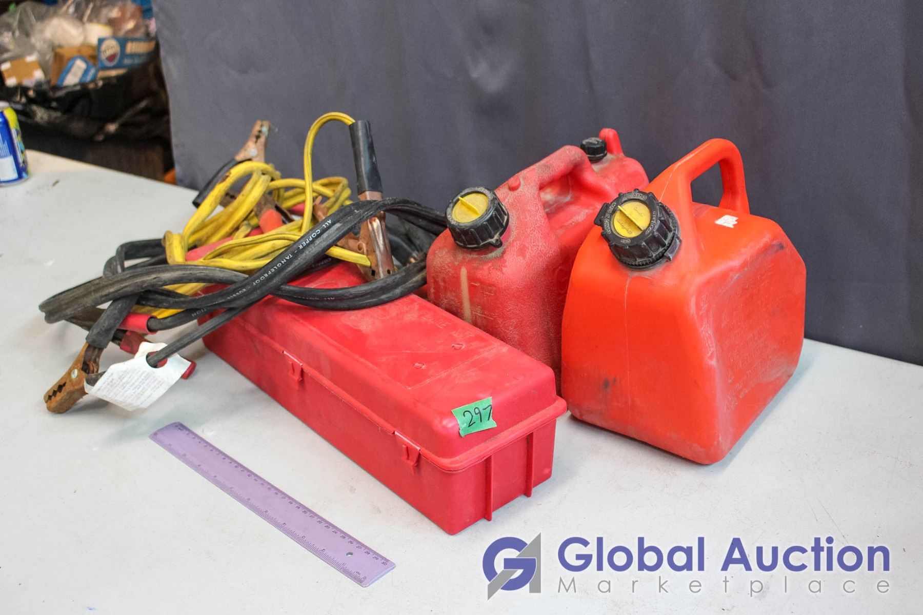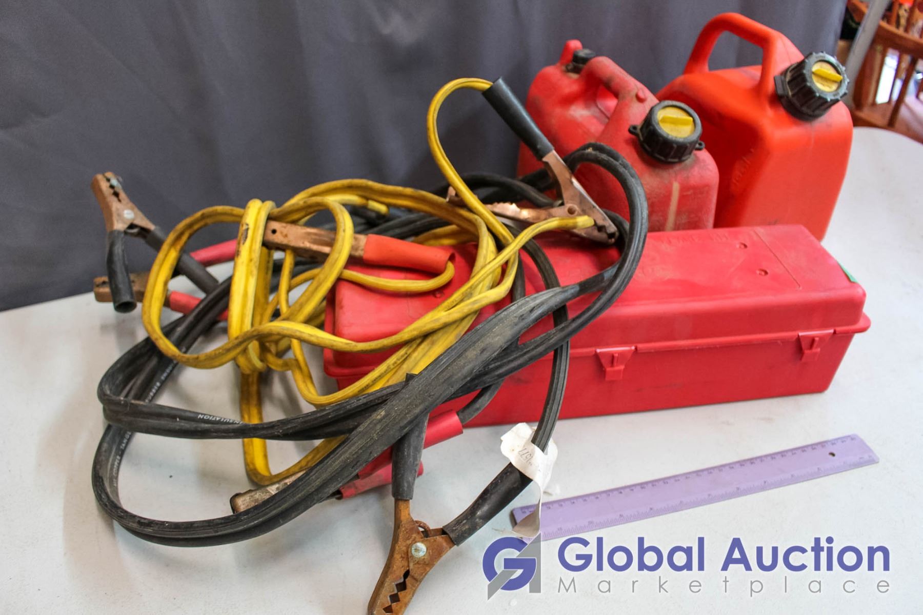 Lot Of Automotive (2 Gas Cans, 2 Sets Of Booster Cables, Flare Kit)