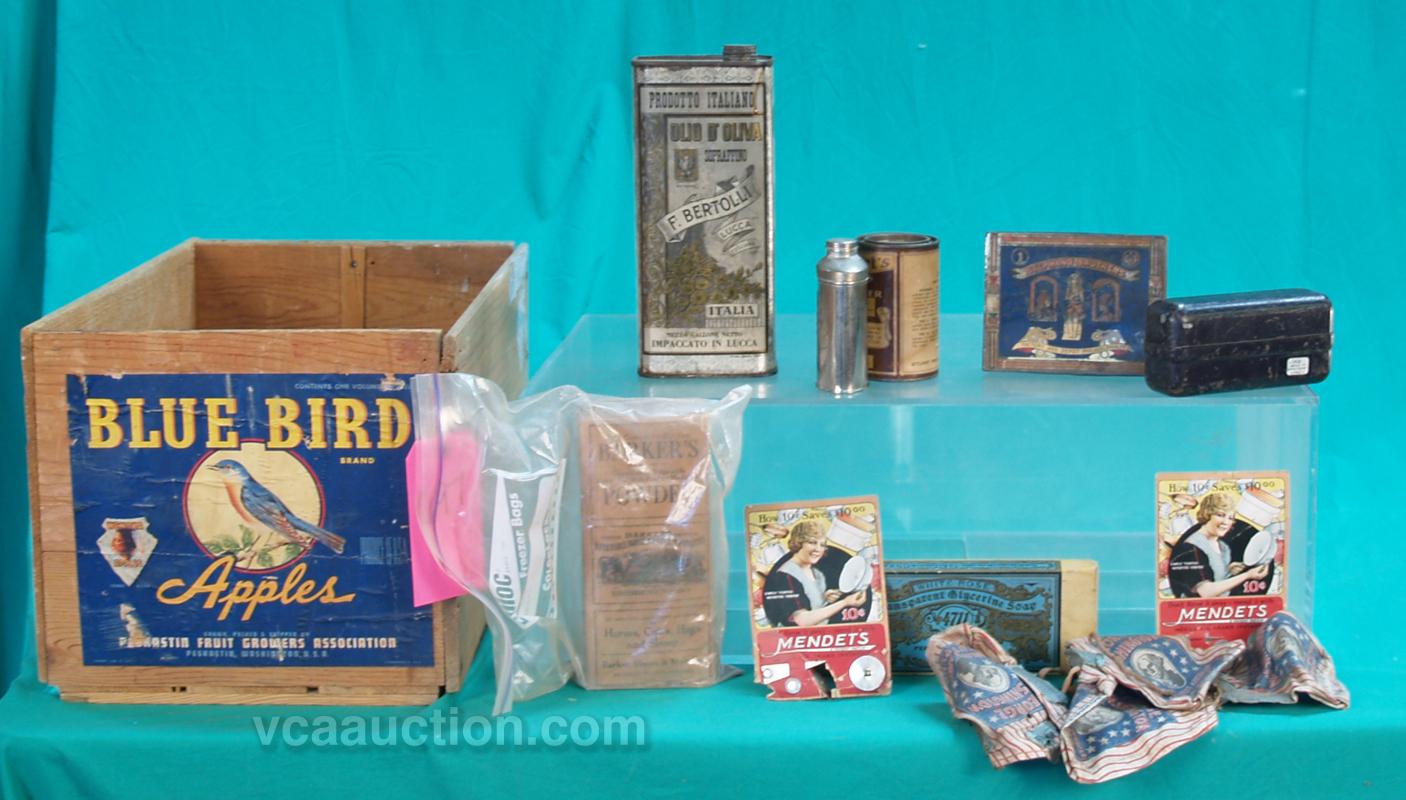 Lot Of Early Country Store Items, including Blue Bird Apples wooden crate, George Washington Cut Plug Tobacco bags, Mendets cardboard display w/ product, Edison Mazda Automobile Lamps tin case w/ product, etc.