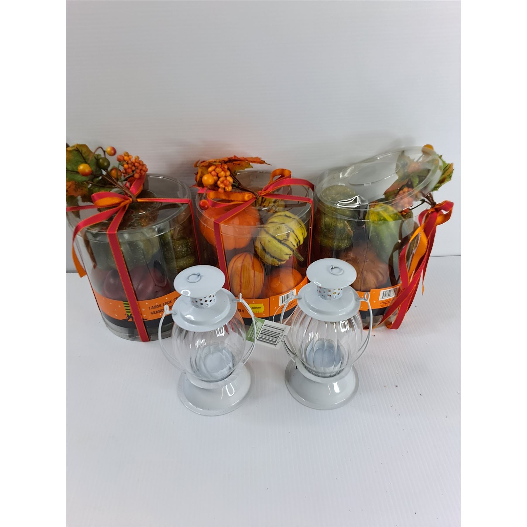 Lot Of Easter Decorations, Artificial Pumpkins, (2) Lantern Candle Holders