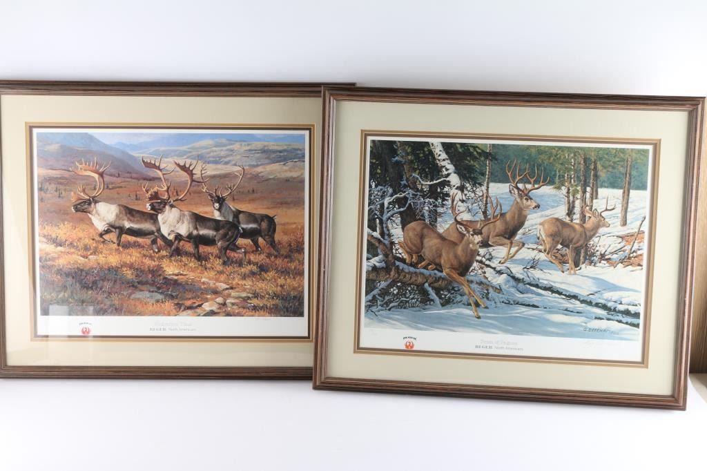 By artists "Tom& Greg Beechman"; "Leon Parson's" an "Gary Swanson" each depicting wildlife in there style of art for "Ruger" were used by Franz Marktl to engrave the Ruger North Americans No1 single shot rifles. All are signed by each artist in pencil. In good condition, framed an nicely matted. All measuring image size of 20x15.