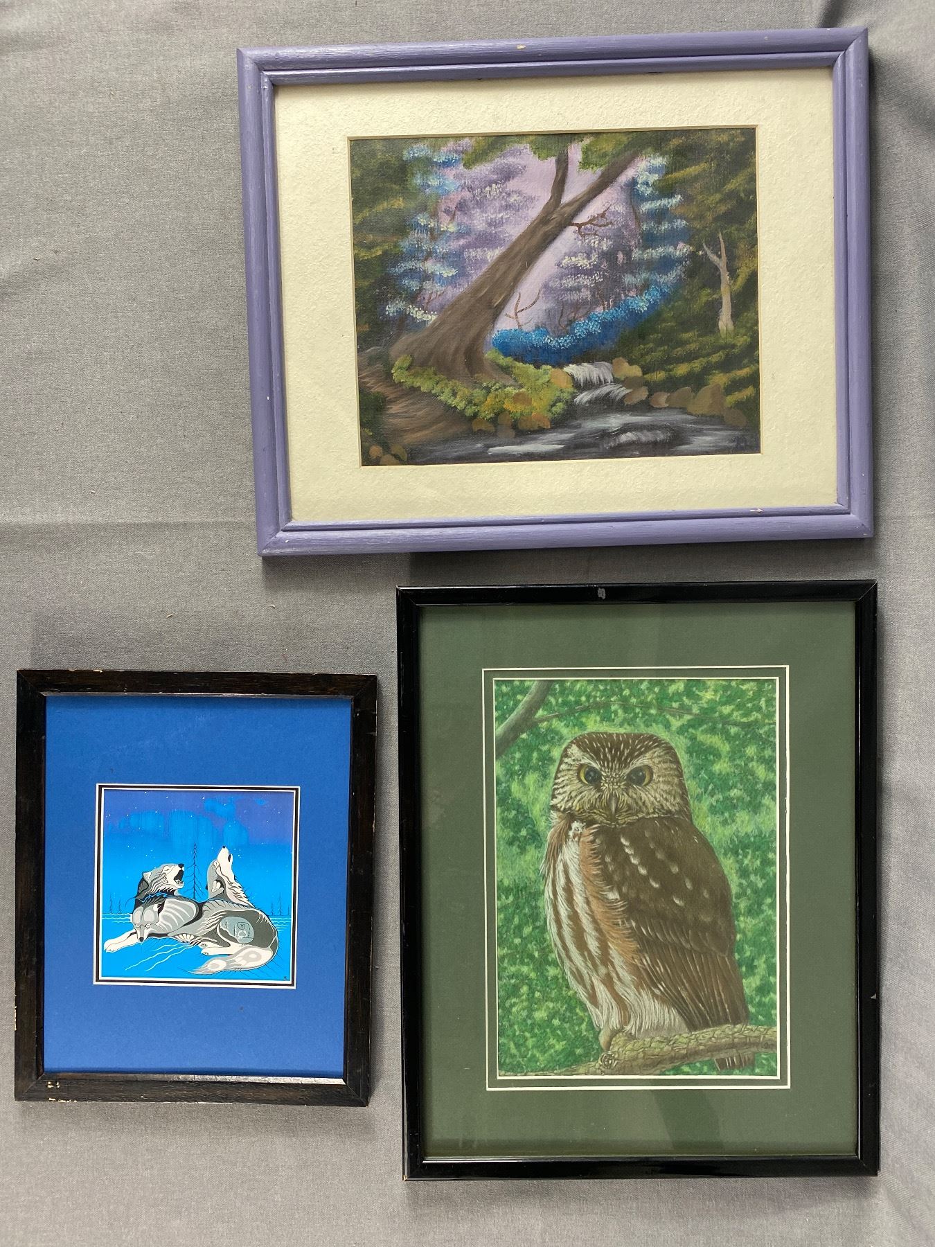 Lot Of Framed Art Work - Owl ( Ap. 12" x 15") Wolves (Ap. 9"x11") & Nature Scene (Ap. 15 1/4" x 11 1/2")