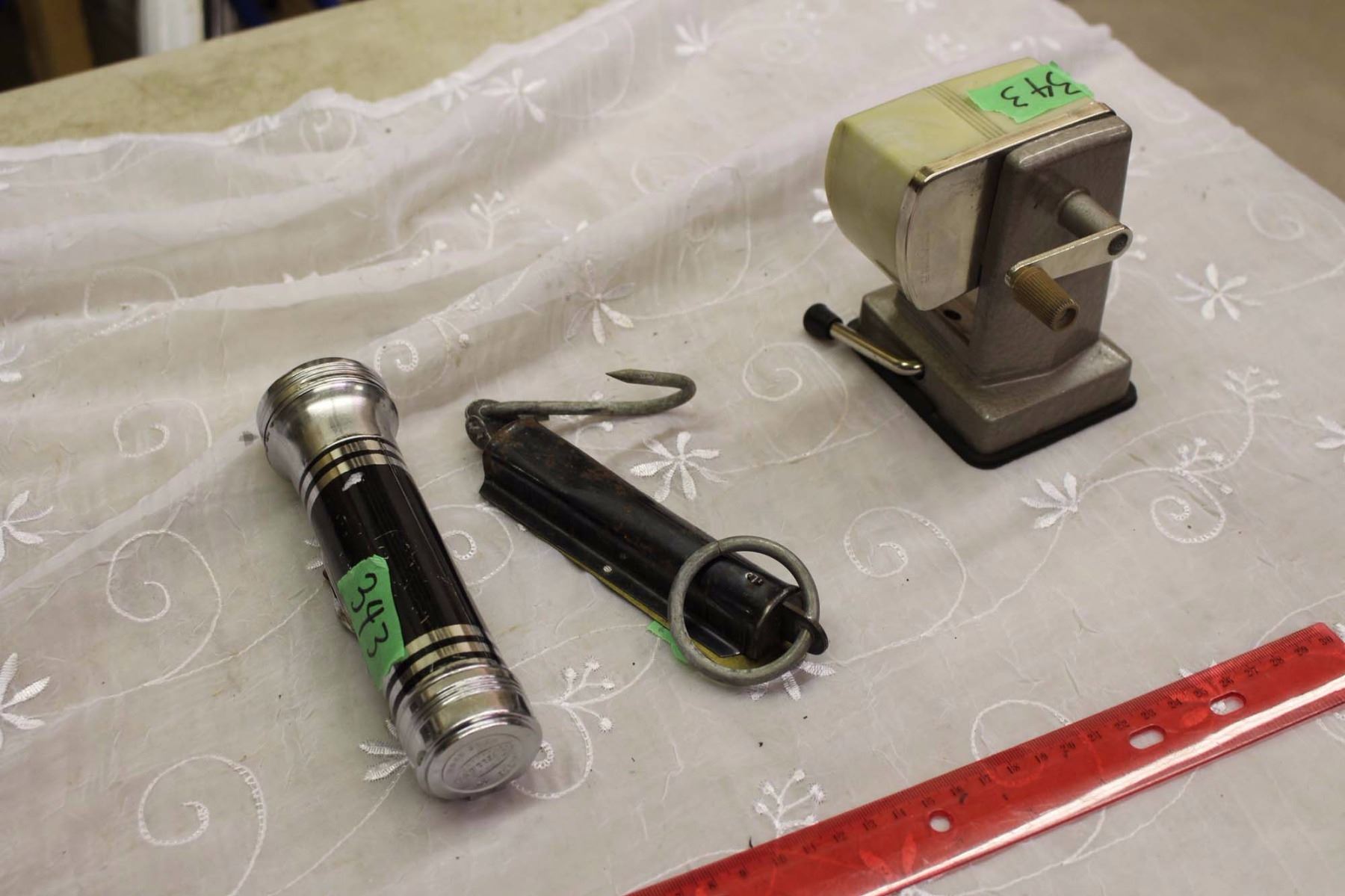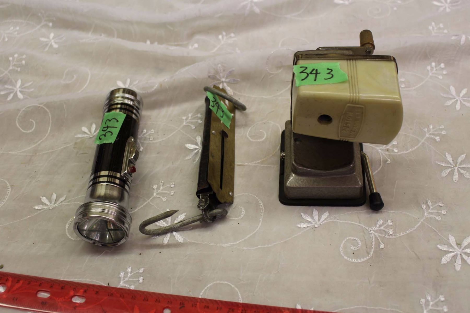 Lot Of Misc. (Antique Flashlight, Pencil Sharpener (Bakelite), Brass Weigh Scale)