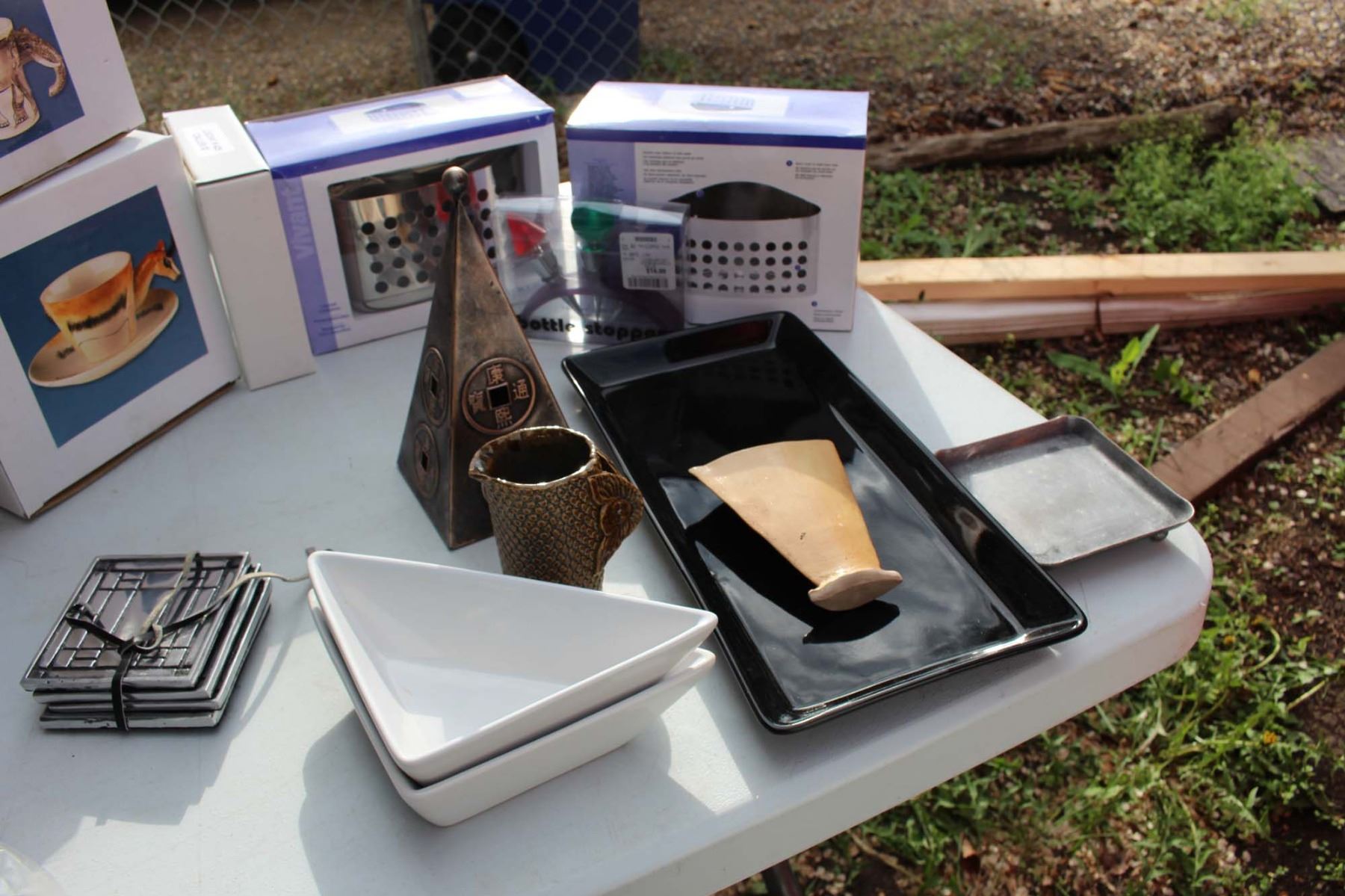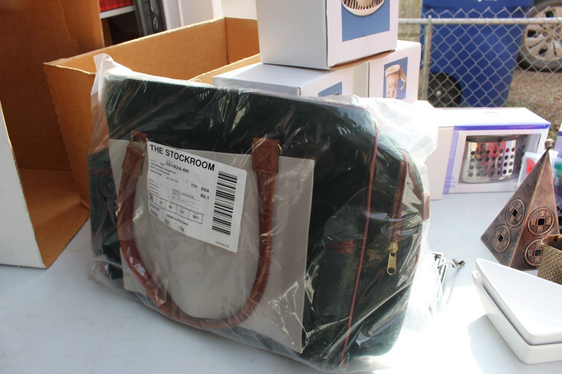 Lot Of NIB Dishware, Green Duffel bag, Etc