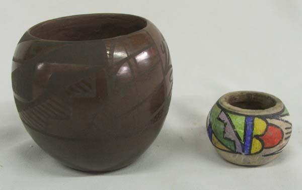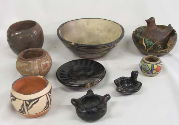 Lot Of Native American Pottery. 10 Pieces, some are Santo Domingo, Jemez and Santa Clara. Largest piece measures approx. 2 1/3''H x 6 1/2'' diameter. Some chipping and cracking and broken pieces. Buyers Pay Actual Shipping and Handling Charges(see terms and conditions for more information).