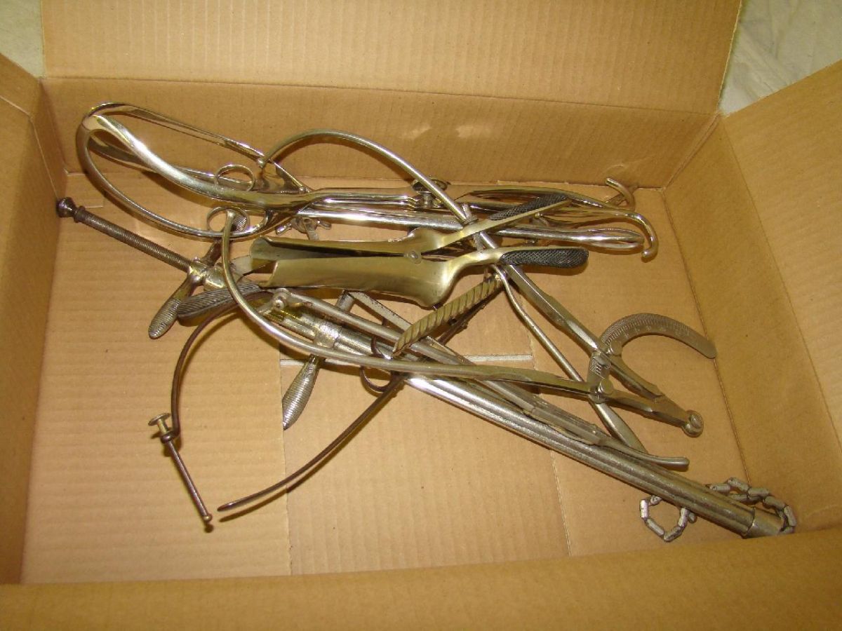 ecraseur, pelvis measure, two-valve vaginal speculum with checkered-ebony handles,etc.