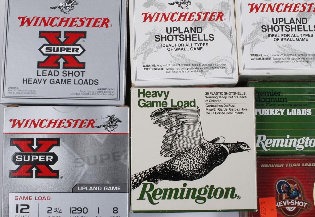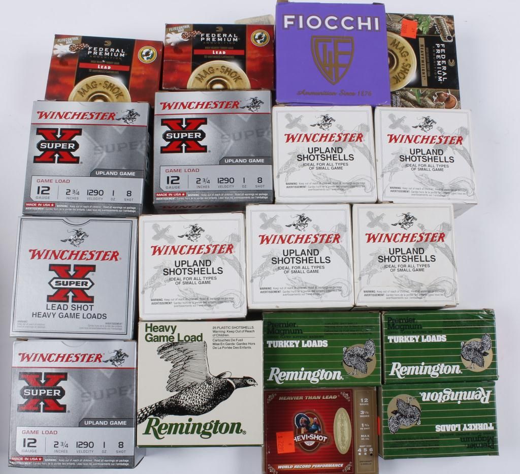 Includes; 5 boxes Win. 20 Ga 2 3/4" #6 shot, Qty 125 4 boxes Win 12 Ga 2 3/4" #8 shot, Qty 100 1 box Fiocchi 12 Ga 2 3/4" #9 shot, Qty 25 1 box Rem 12 Ga 2 3/4" #4 shot, Qty 25