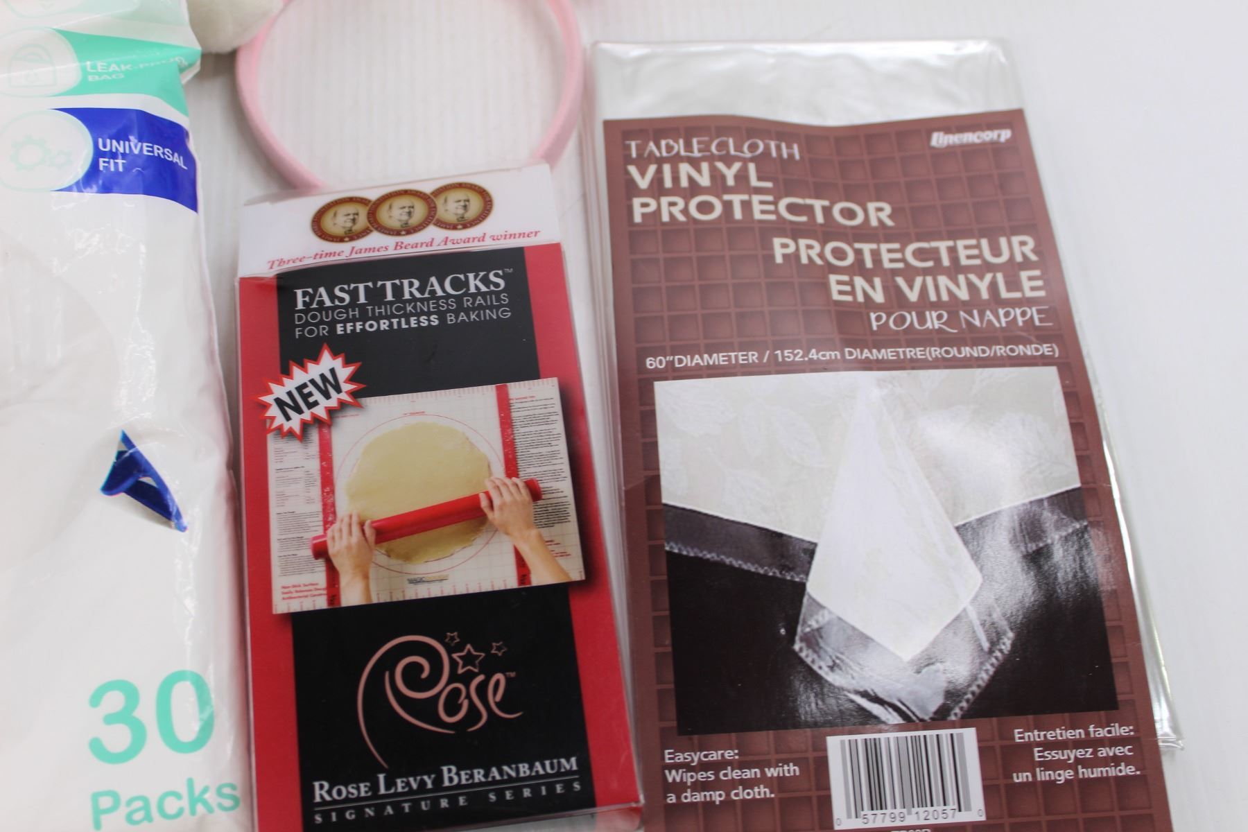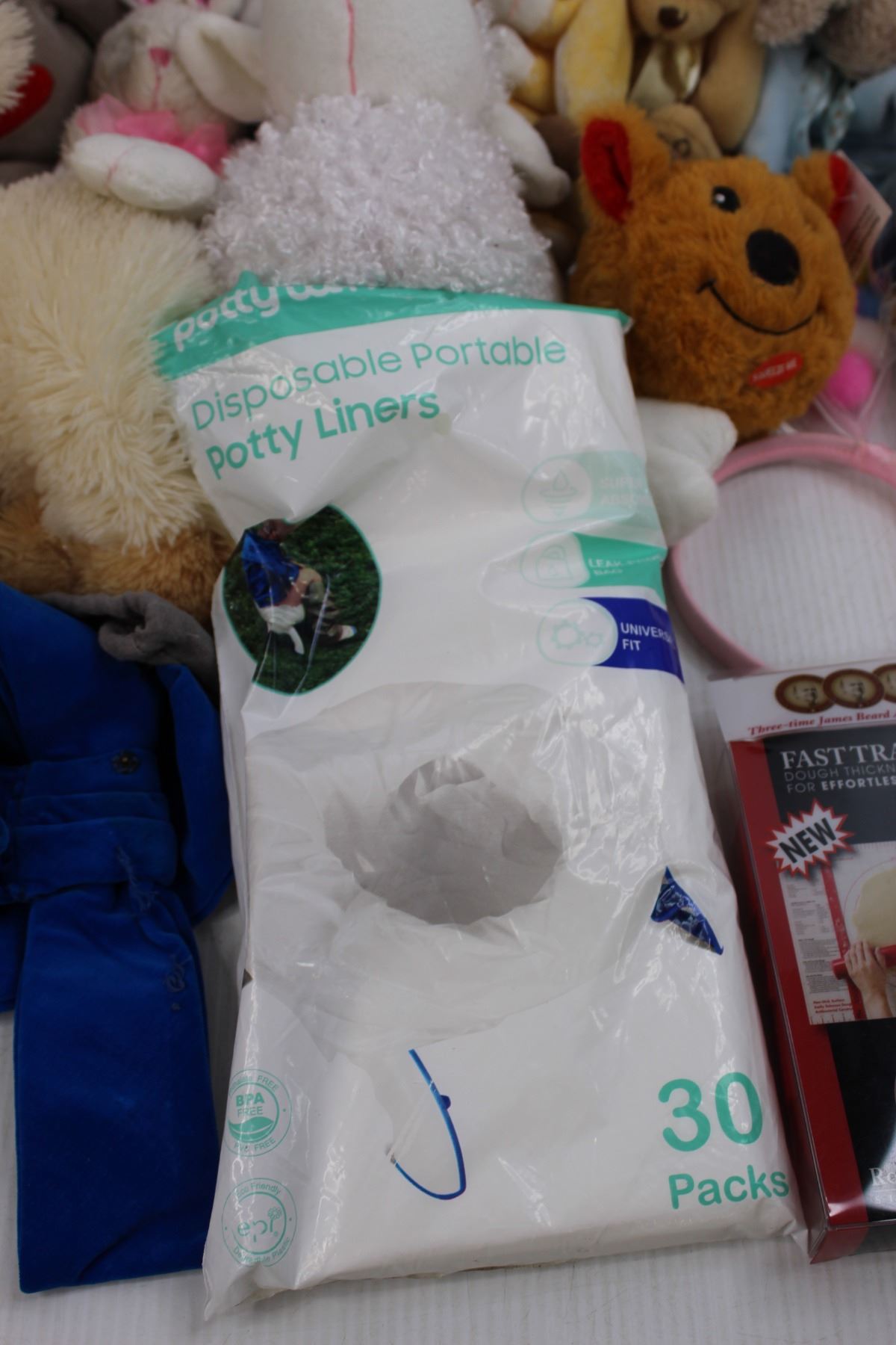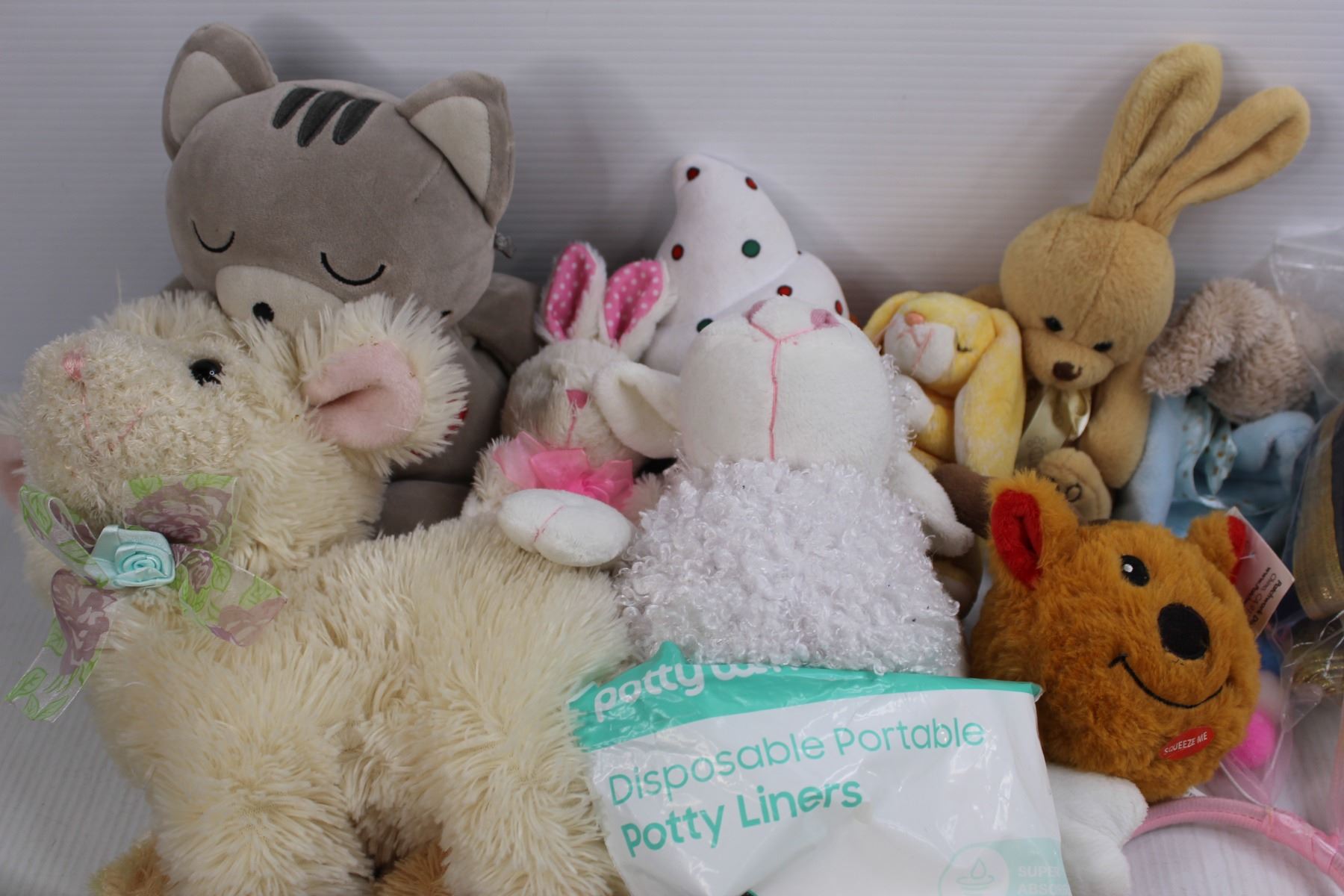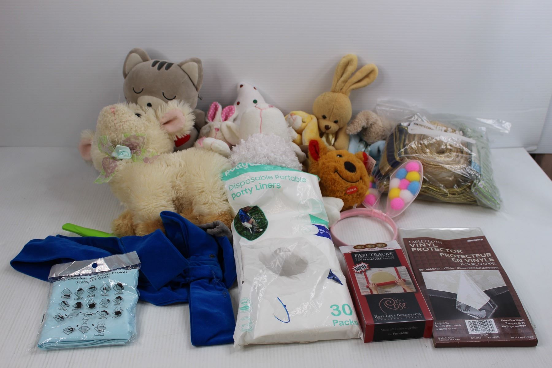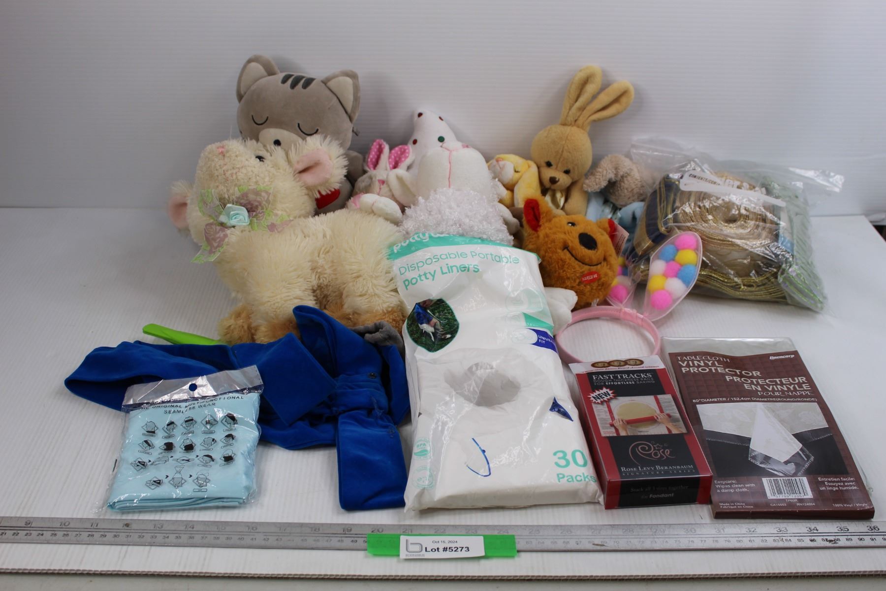 Lot Of Stuffies, Disposable Potty Liners, Vinyl Protector Tablecloth, Bunny Ear Headband, Misc.