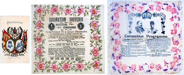 ROYALTY] Grouping of three different programs from the coronation in 1902 of King Edward VII & Queen Alexandra at Westminster Abbey. 1) Delicate crepe napkin “Coronation Souvenir and Official Programme,” dated August 9th, 1902; directions of the route and other details. ON the bottom “God Save the King and Queen” bordered with rich pink flowers and green leaves. 2) Even more delicate silk textured napkin picturing the royal couple and with pink and purple flowerets bordering the text of the program. Both have fold marks and present a wonderful display. 3) Heavy 4 p. card of the program “Programme Souvenir.” Very Good.
