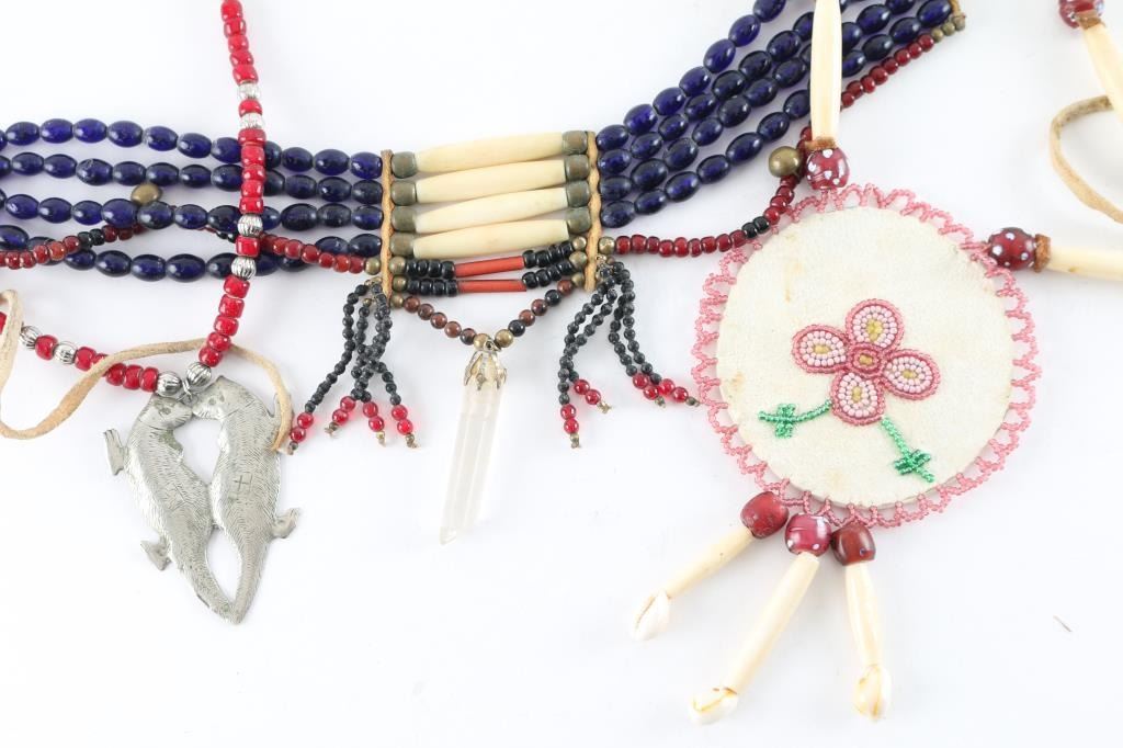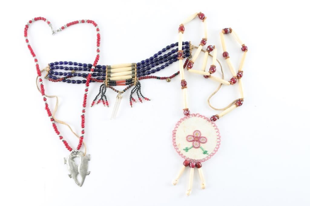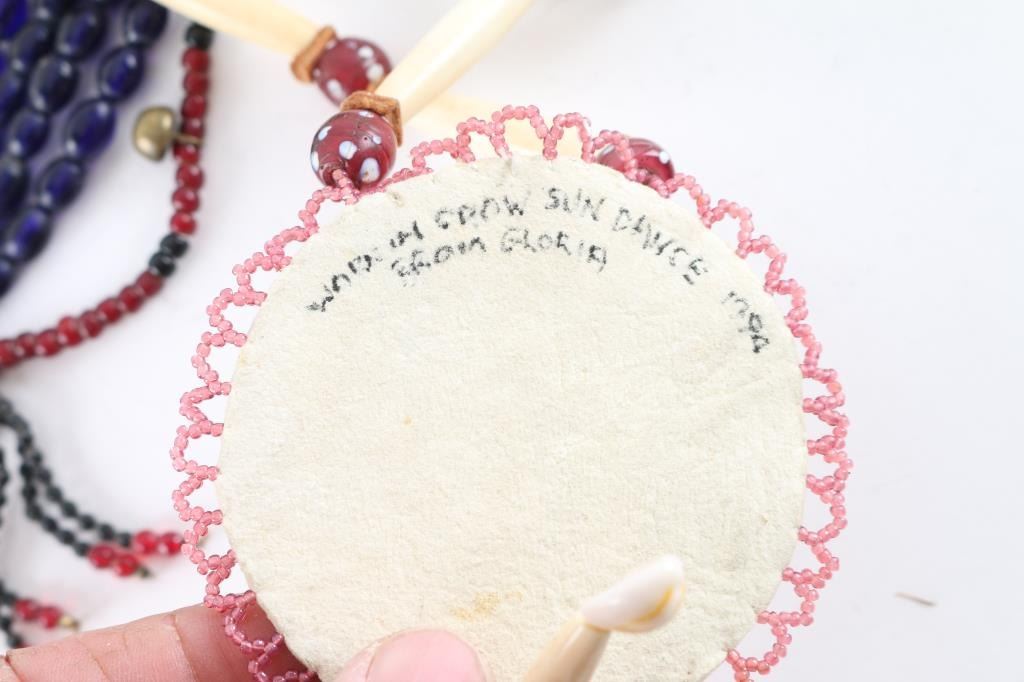 1.) Cobalt glass bead chocker, accented with single crystal pendant. (2.) A red heart glass bead necklace with sterling ferret pendant(3.) A bone beaded necklace worn by "Crow Sundancer Gloria" dated 1994.