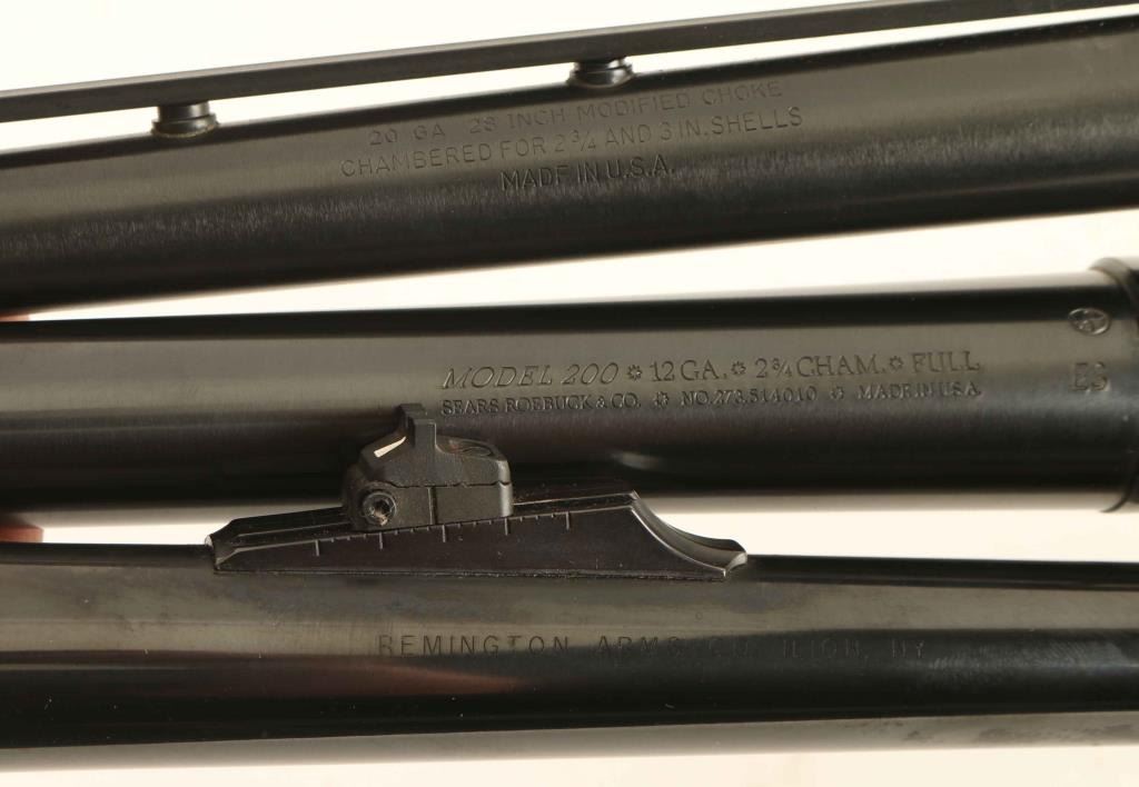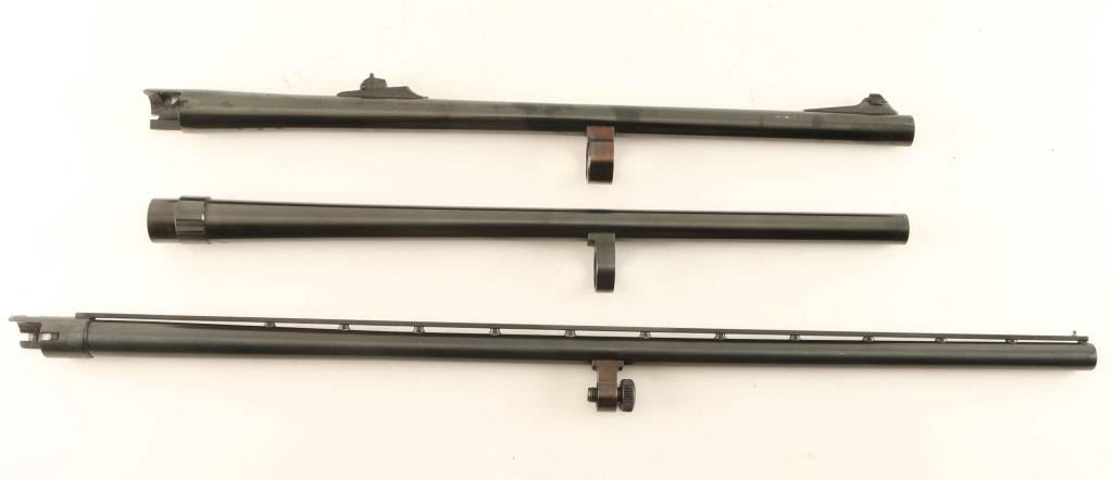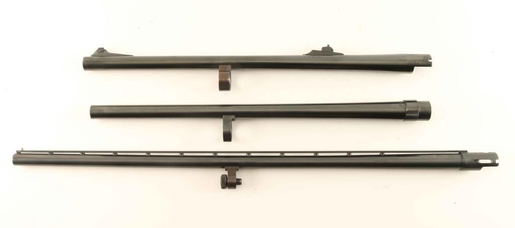 lot of three shotgun barrels. A Mossberg 20 ga. 28" chambered for 2 3/4', and 3' shells. ventilated sighting rib. Like new. A Sears, Roebuck, & Co. 19 1/2". 12 Ga. 2 3/4 chamber. Full. Dirty, some flaking around muzzle. Remington 16 Ga. 20 ' 2 3/4". Sights. dirty, Bore bright.