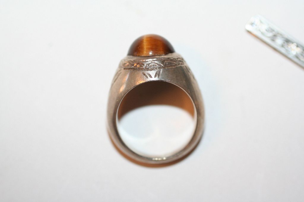 This lot includes a set of vintage tiger eye cuff links, 2 tie clips, & ring (size 7)