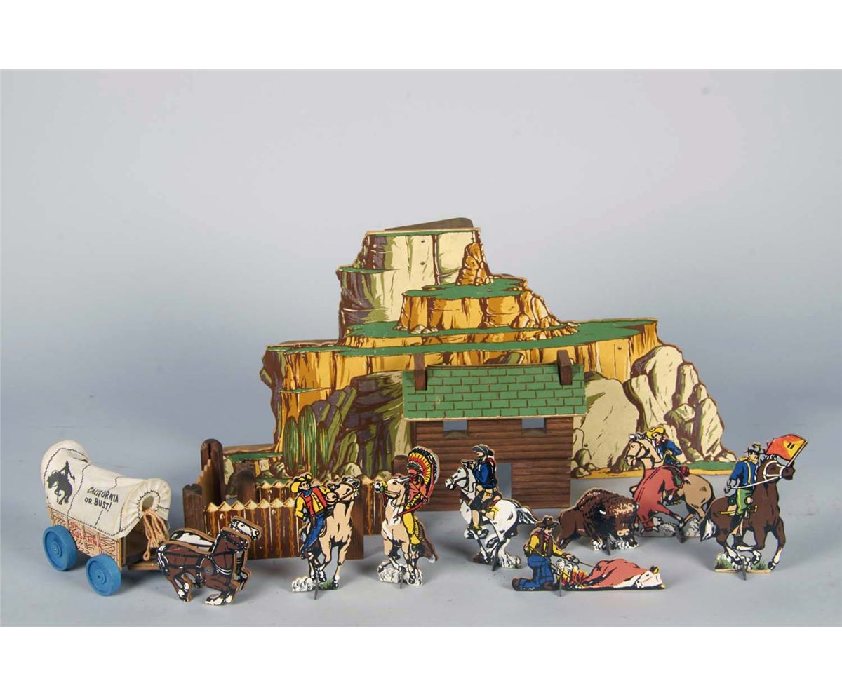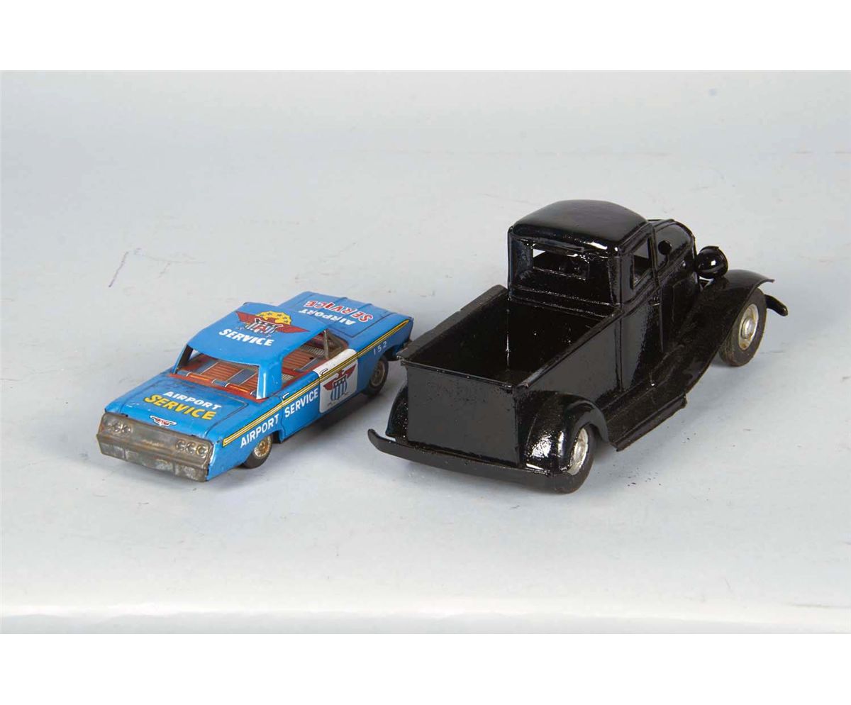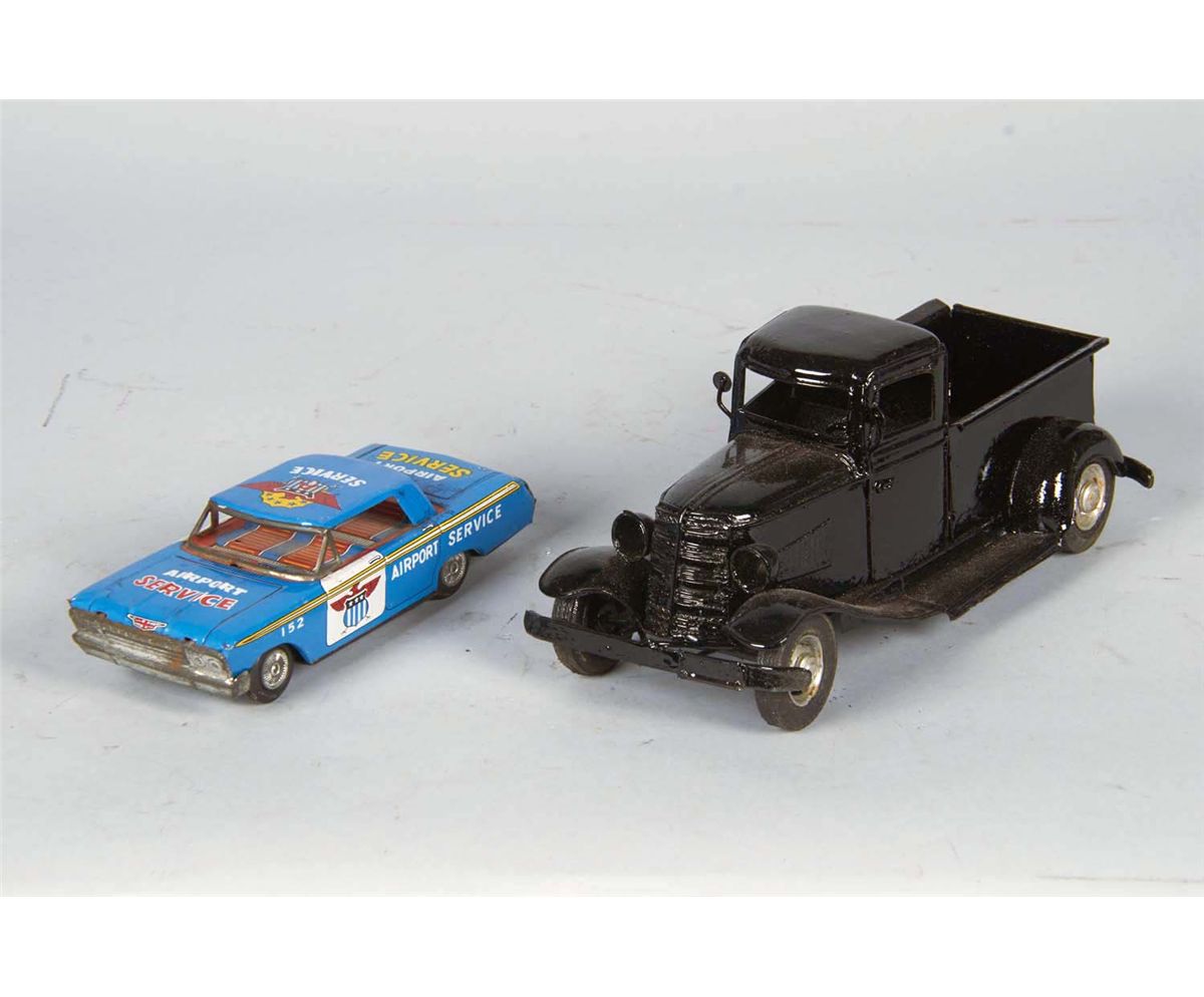 Including 12 pc Keystone Frontier Western Shooting Target Set 1950's, 1 - 1960's Tin Litho Chevrolet Made In Japan Friction Airport Service Cab toy, and 1 - Repainted 1930's model black pick-up truck Condition (Good). Size Up to 22" L.