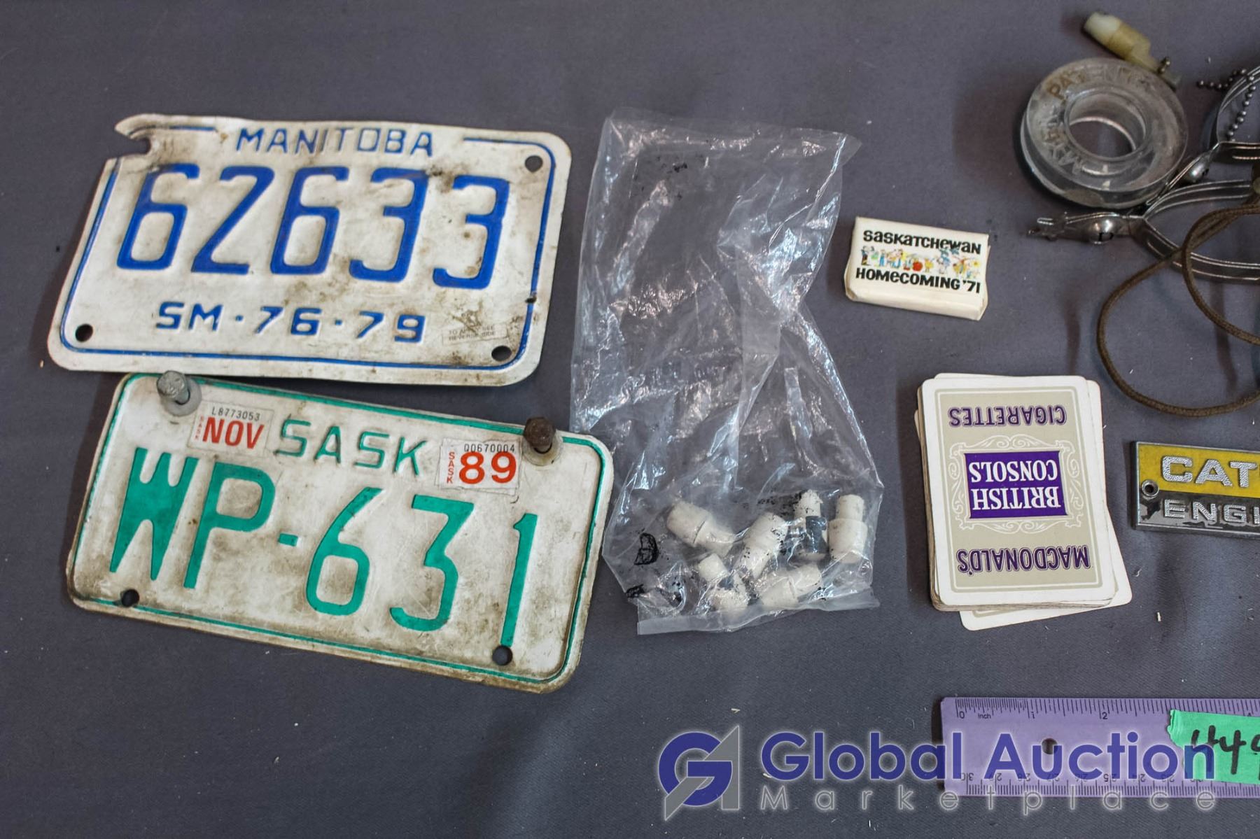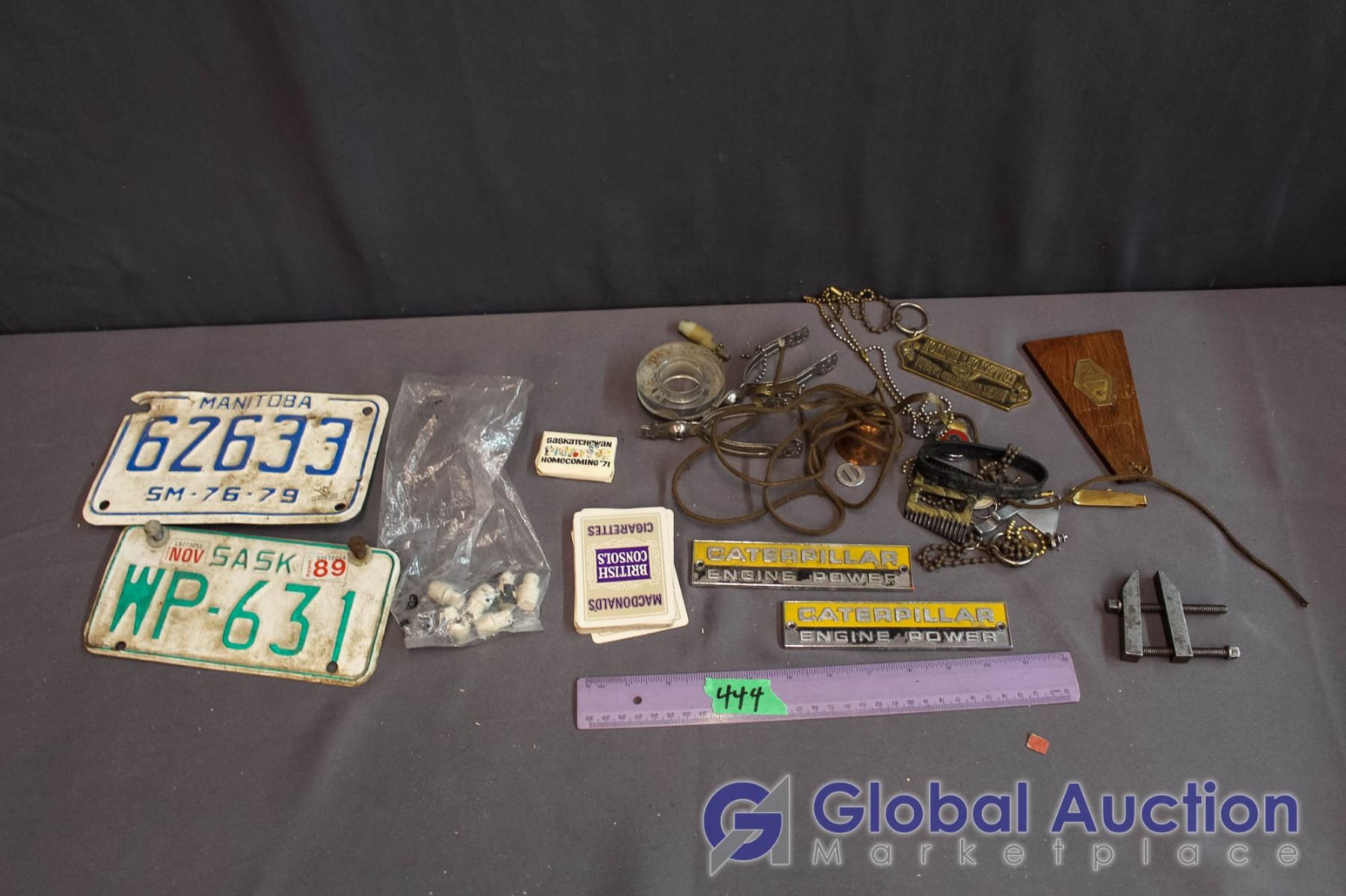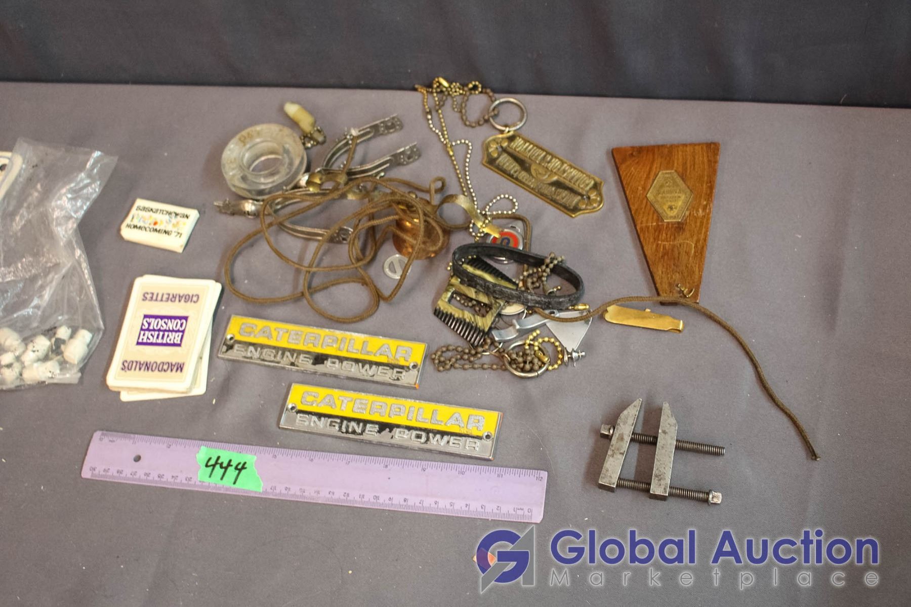 Lot Of Trinkets (Motorcycle Plates, Caterpillar Emblems, Etc)