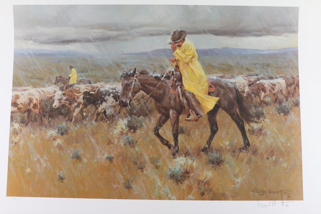 1.) By artist "James Bama, entitled "Portrait Of Sioux, limited edition print numbered 356/1500. Unframed and signed lower left. Image size measures 31x23.(2.) By artist "Gary NIblett" entitled "Rain or Shine" limited edition print numbered 162/950. Signed lower left , and unframed in art folio, image size measures 32x25.
