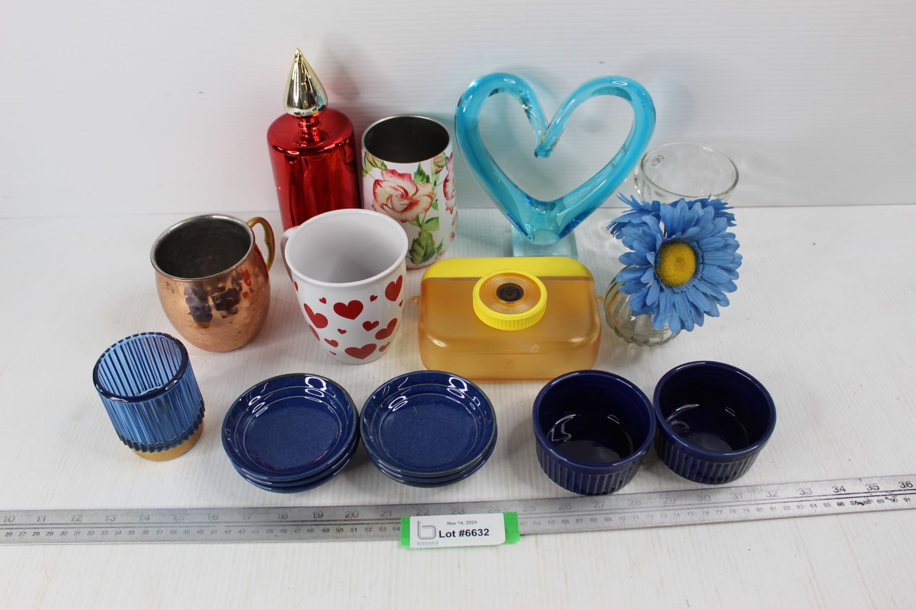 Lot Of Various Cups, Sashes, Misc., Art Glass Heart Decor, (6) Small Blue Plates w/ (2) matching Bowls, Misc.