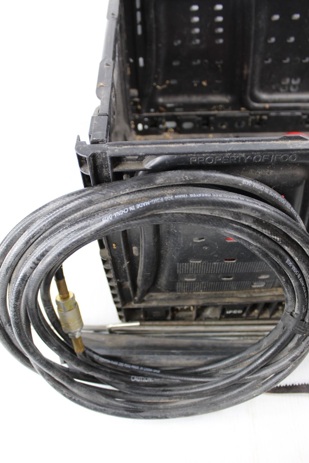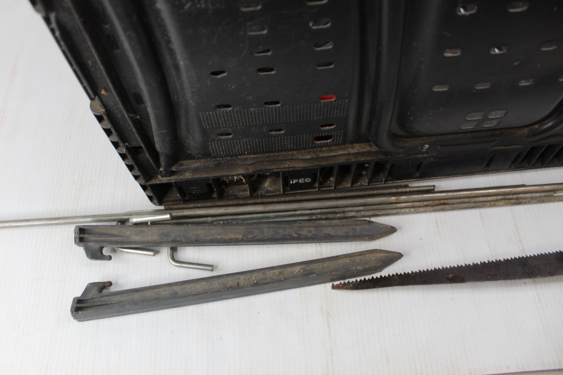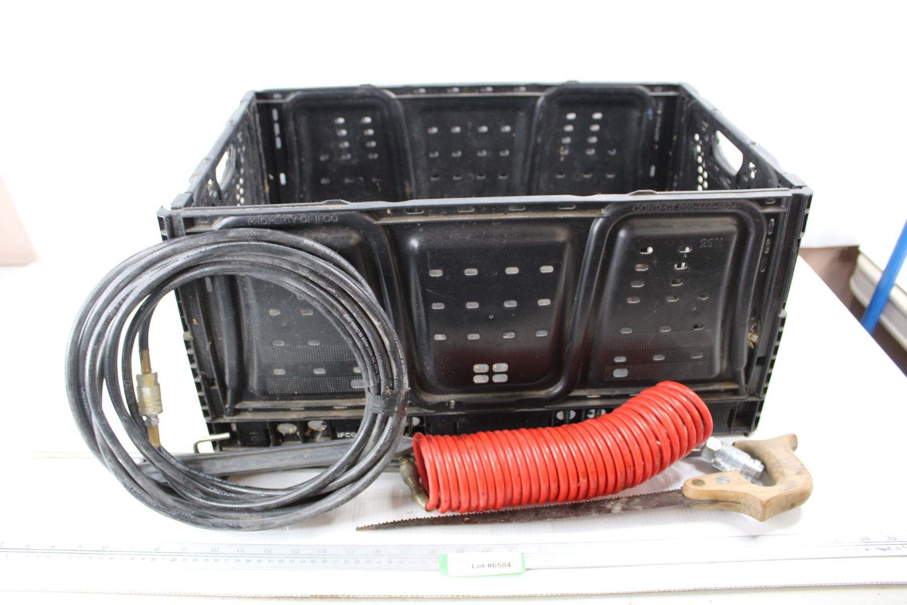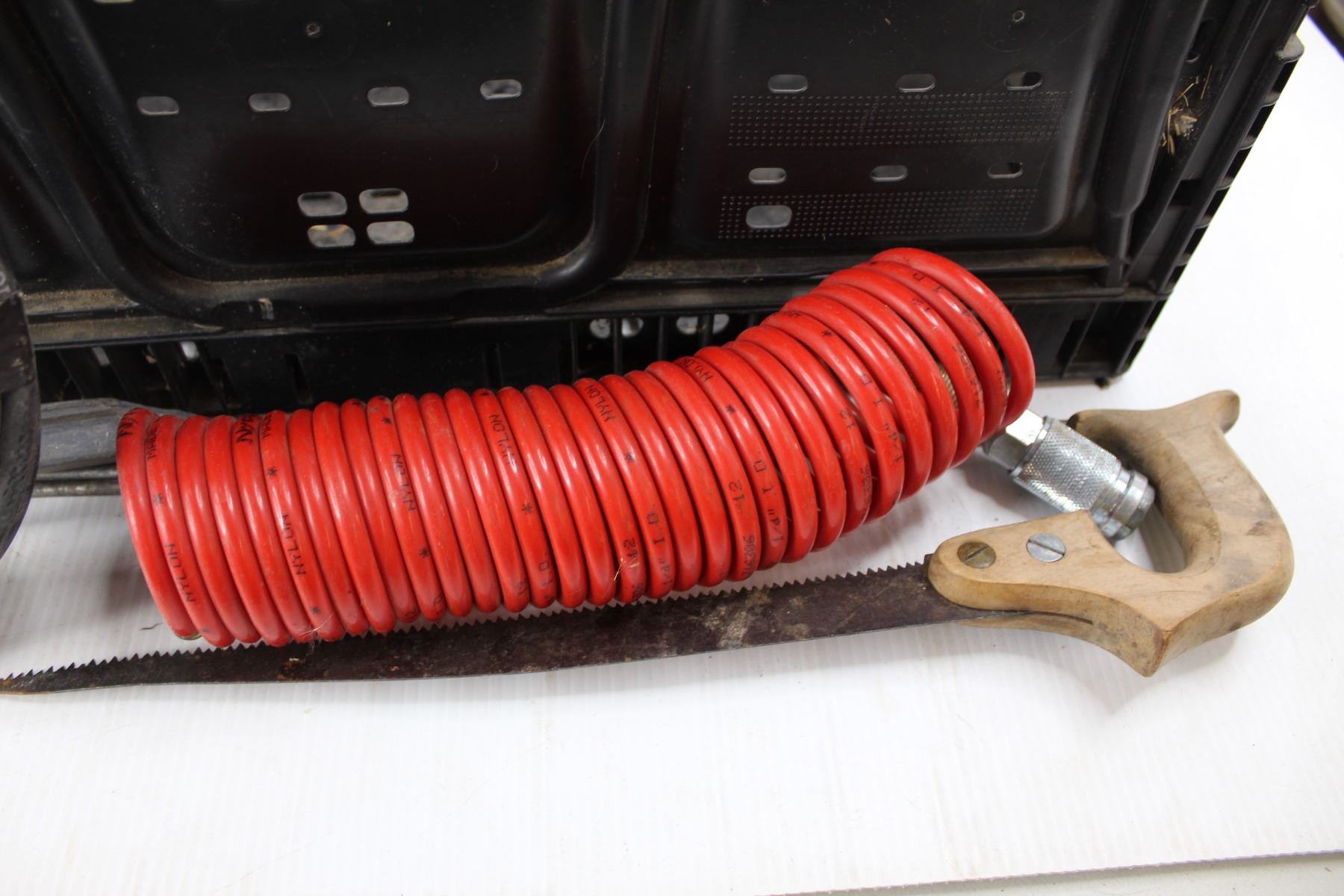 Lot Of Various Hardware Items, Plastic Tote, Air Compressor Hose, Metal Marking Spikes