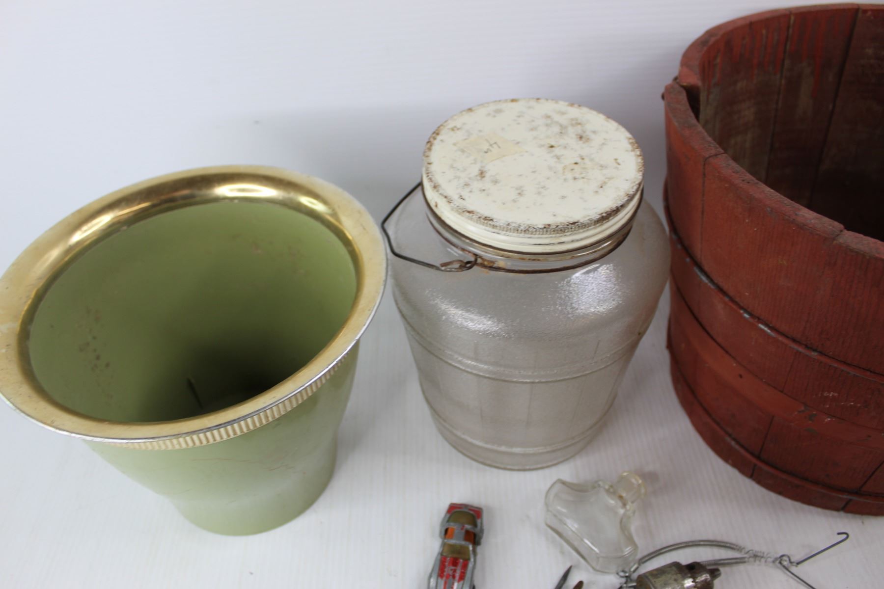 Lot Of Various Items, (2) Flower Pots, Jar w/ Various Items