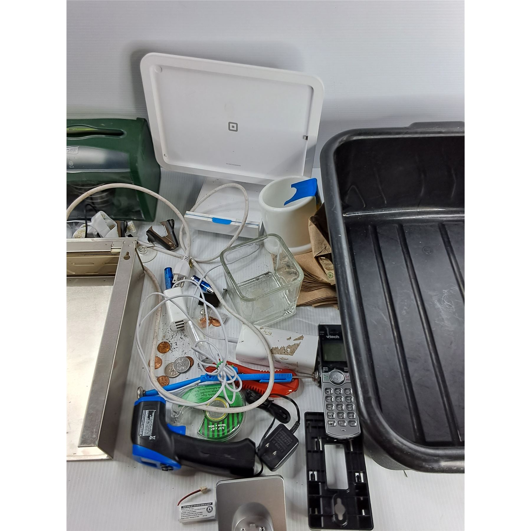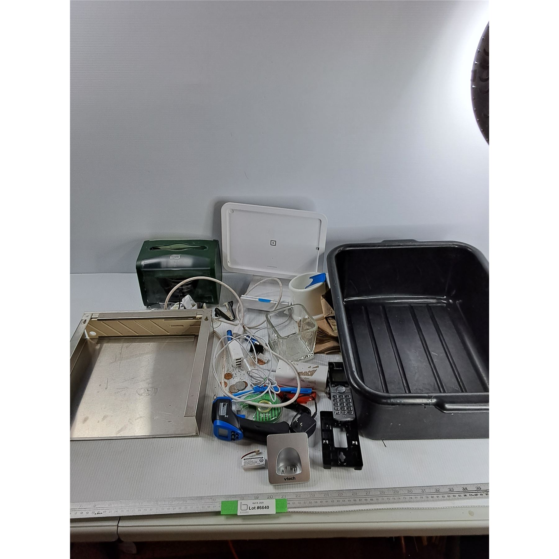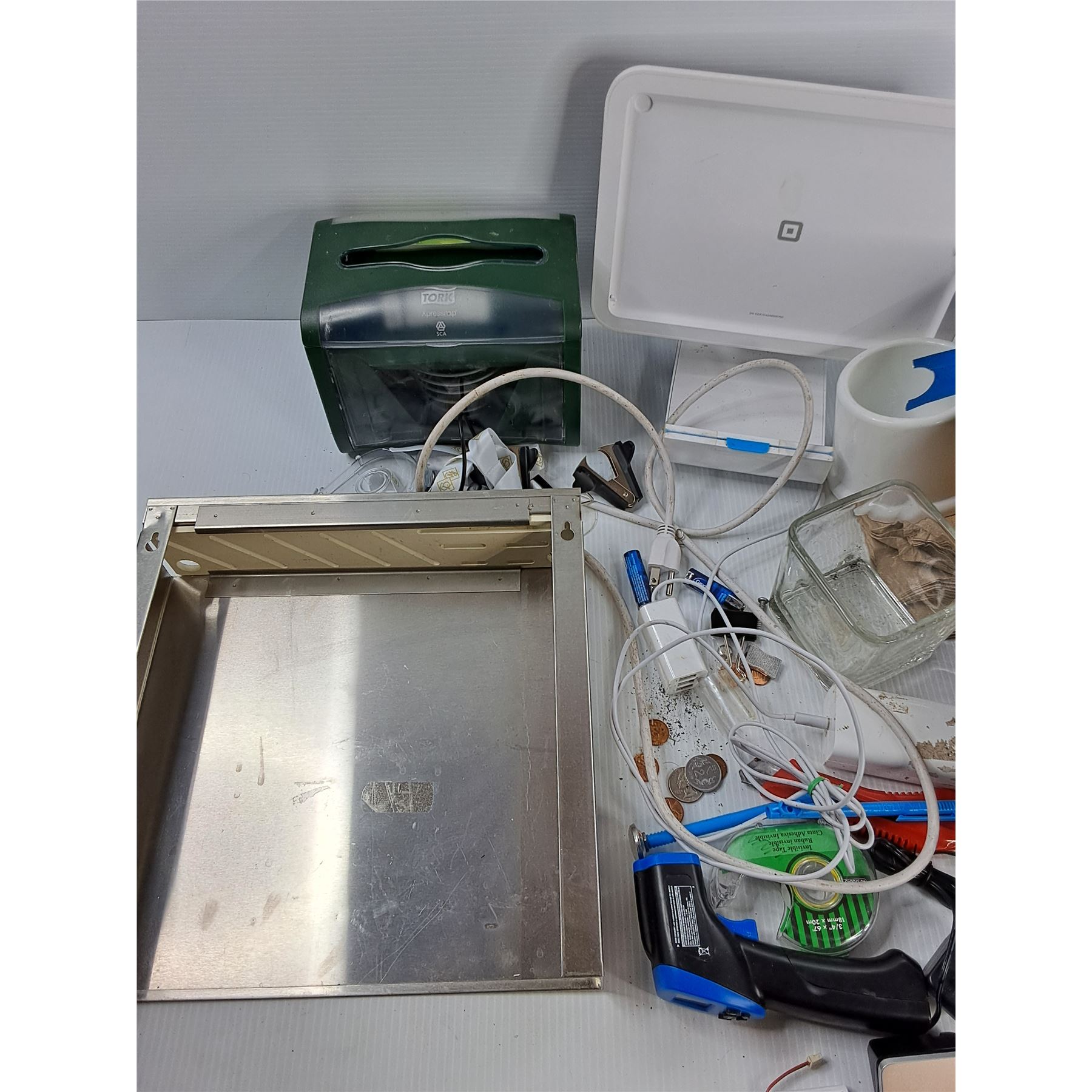 Lot Of Various Items, Large Platic Bin, 20.5" x 15.5" x 7", Work Commercial Napkin Despener, Misc,