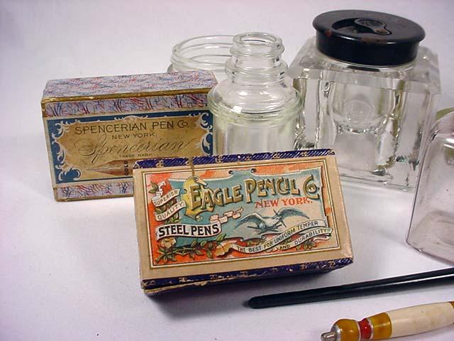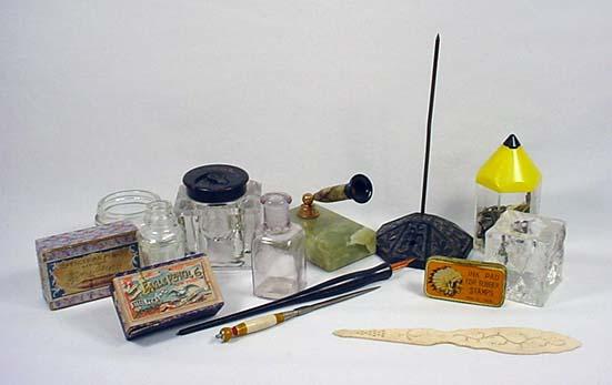 Lot Of Vintage Desk Items - Incl. Inkwells - Also Incl. Pen Nibs, Indian Tin Ink Pad, More!