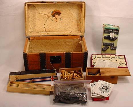Lot Of Vintage Games In Trunk - Incl. Dominoes, Pick-Up Sticks, Chess, More