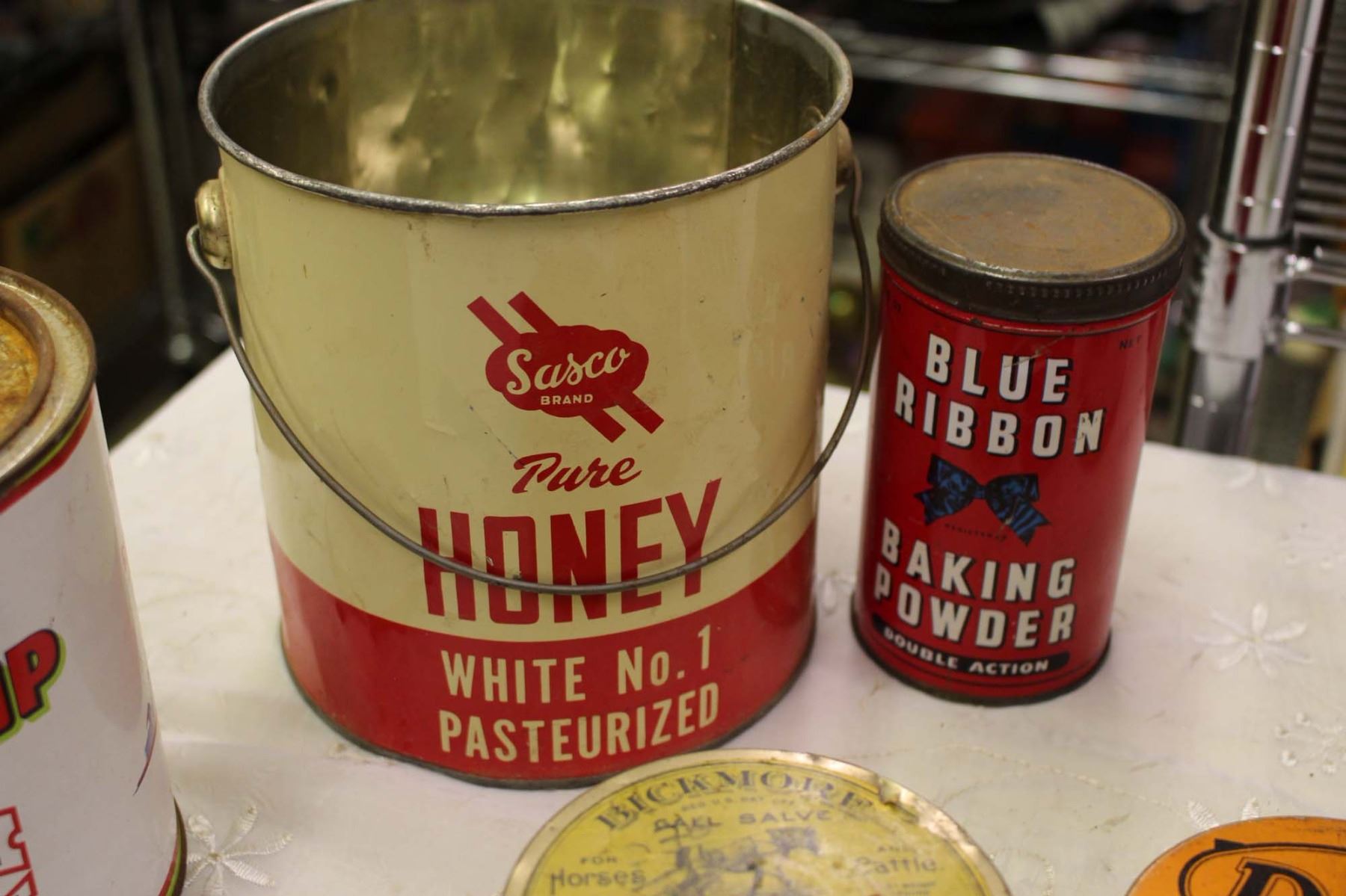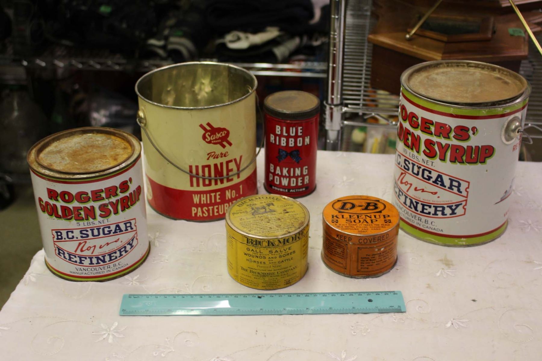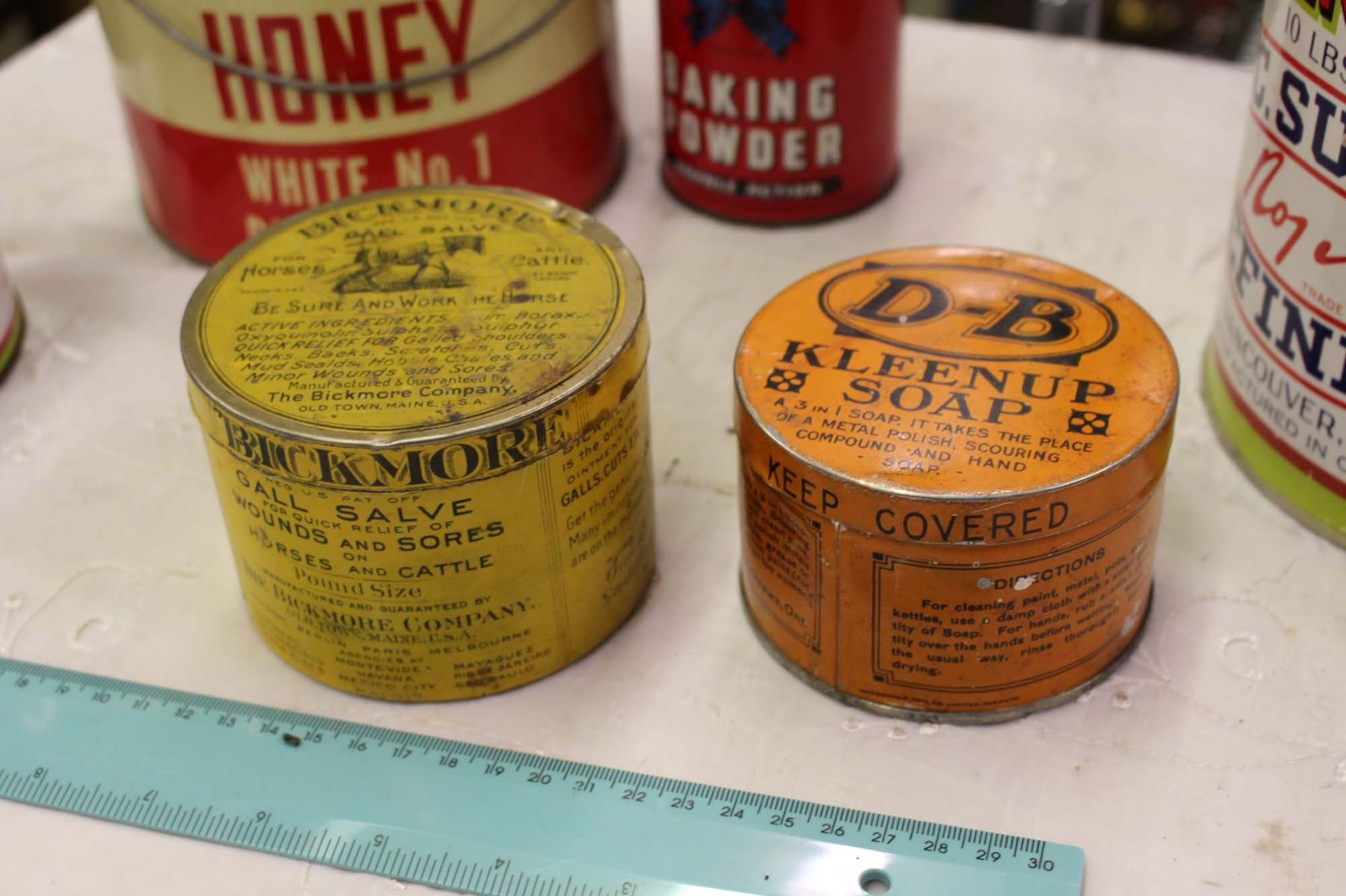 Lot Of Vintage Tins (Honey, Syrup, Baking Powder, Salve, Soap)