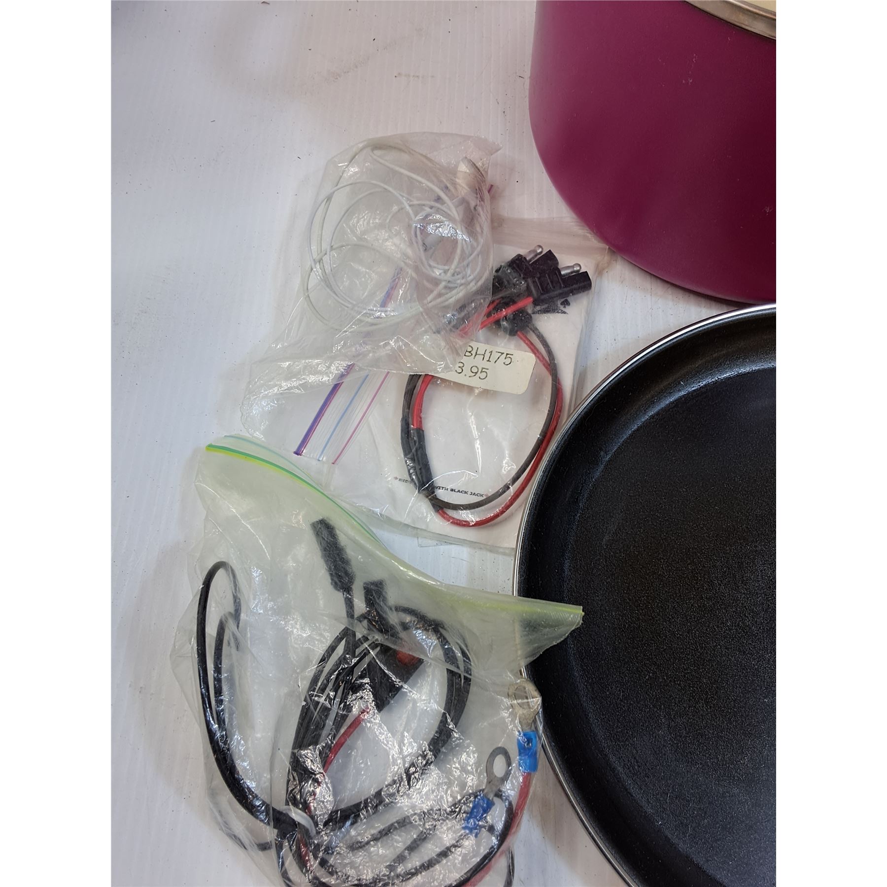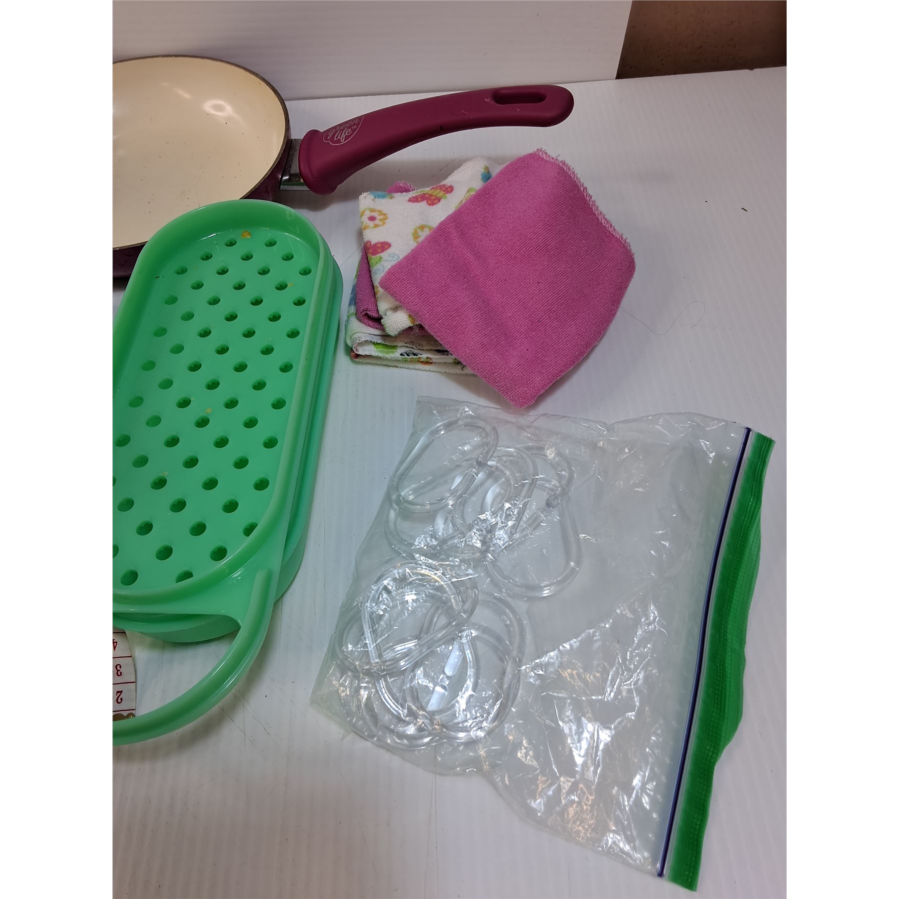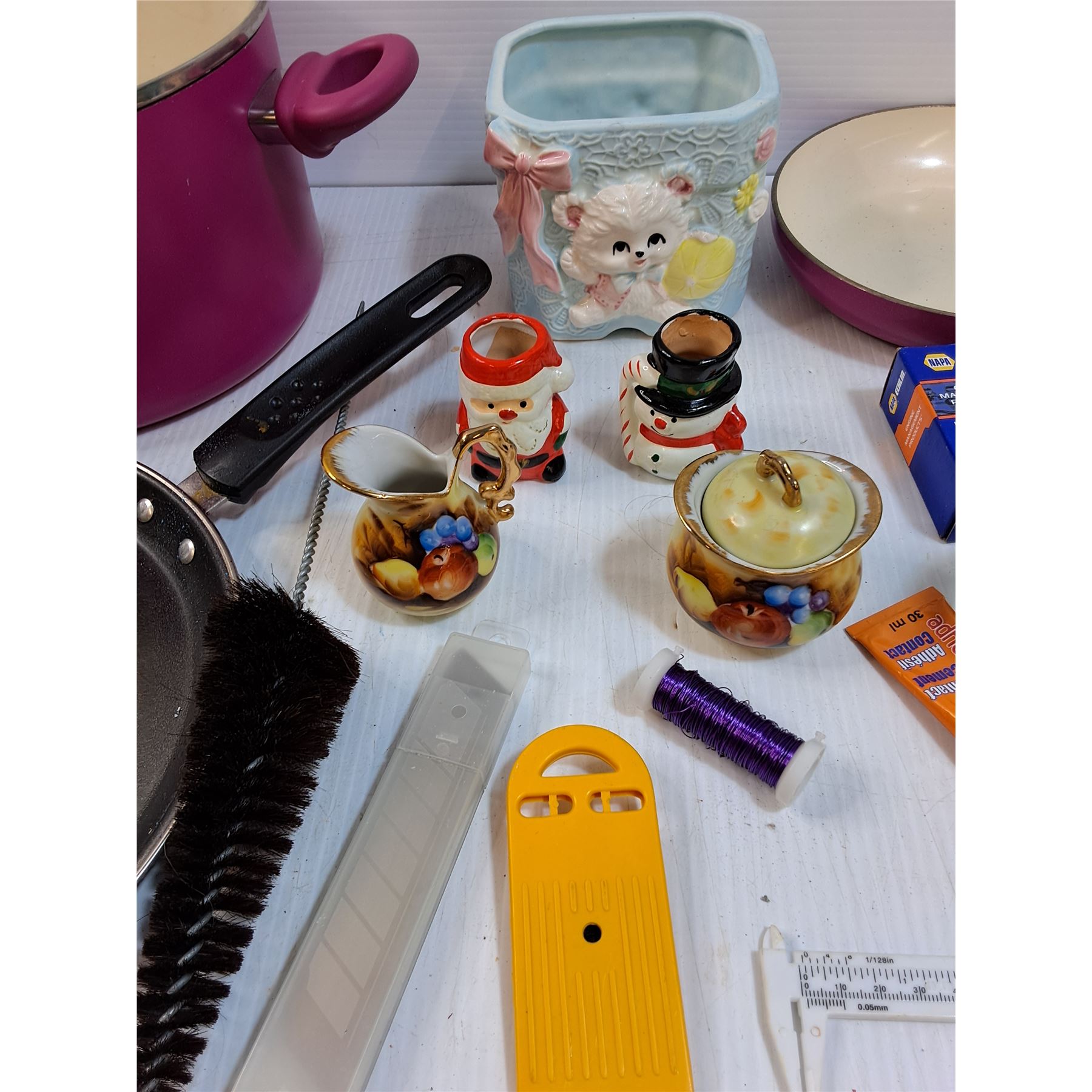 Lot: Pink Kitchen Pots, Frying Pan, Tupperware Cheese Grater, Christmas Toothpick Holders, Misc
